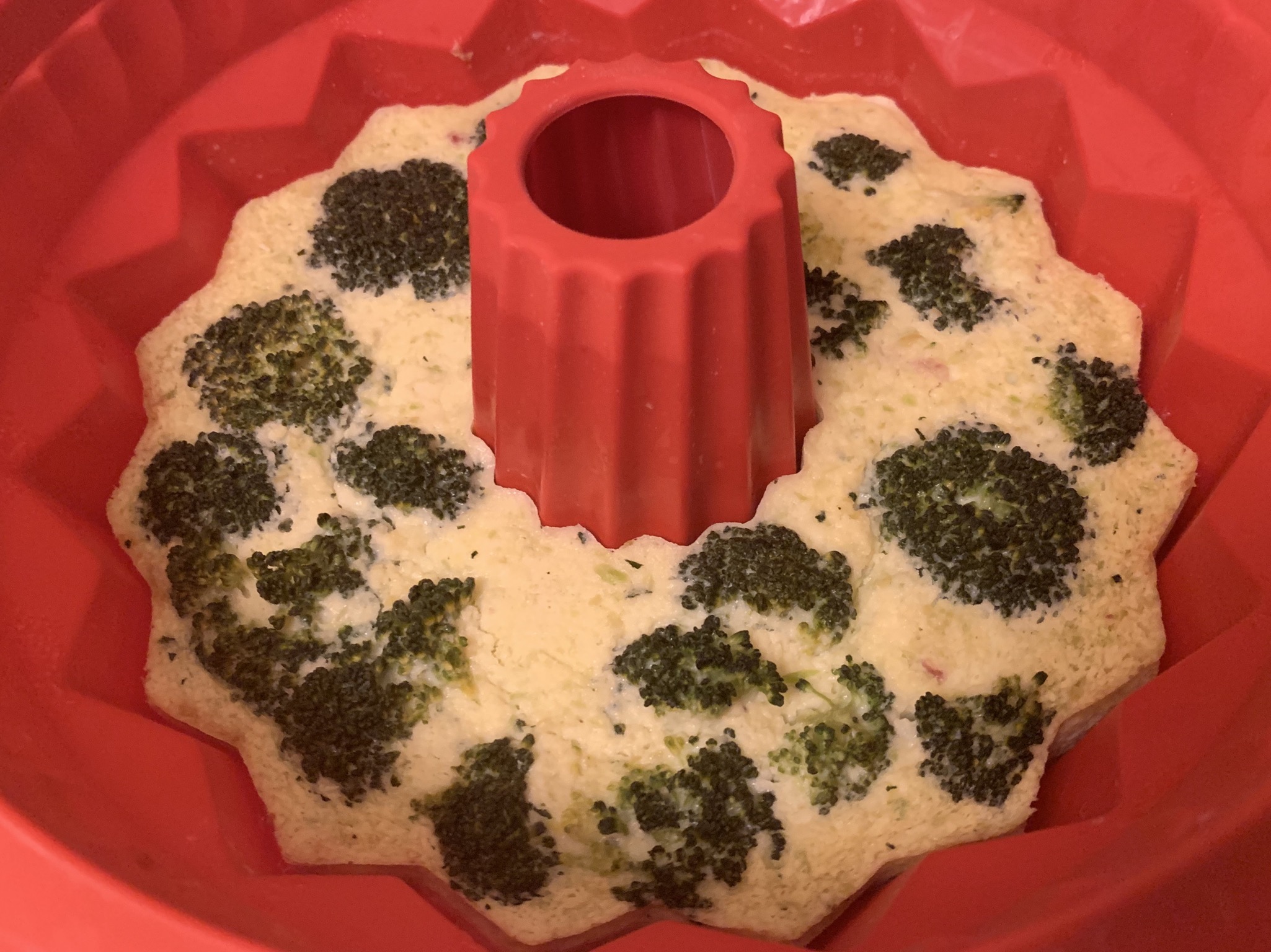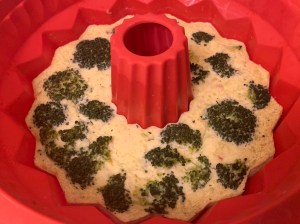 Vertemos la mezcla en el molde y la repartimos bien. Si hemos optado por dejar trocitos de brócoli a la vista, colocamos los arbolitos que habíamos reservado, repartiéndolos bien.