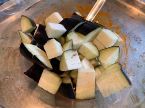Lavamos las berenjenas y las troceamos en dados de unos 2 dedos de grosor. Las pasamos al bol y las embadurnamos bien con la salsa.