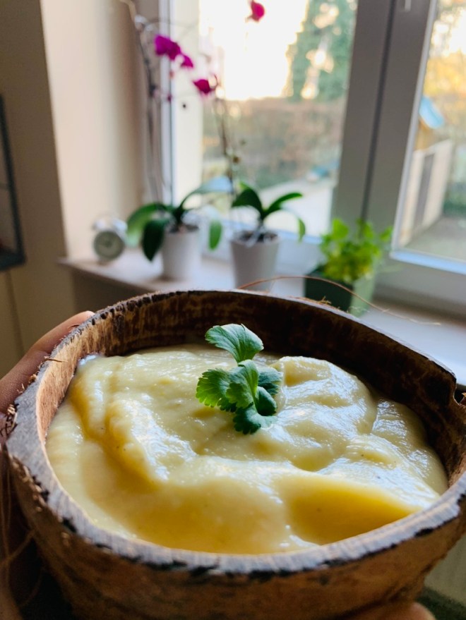 Comprobamos que la patata esté tierna (es la única que no debemos comer cruda) y trituramos con una batidora dejando la consistencia que nos guste – como os decía al inicio, yo lo dejé espeso tipo puré y lo acompañé de un huevo poché y cebollita deshidratada por encima.