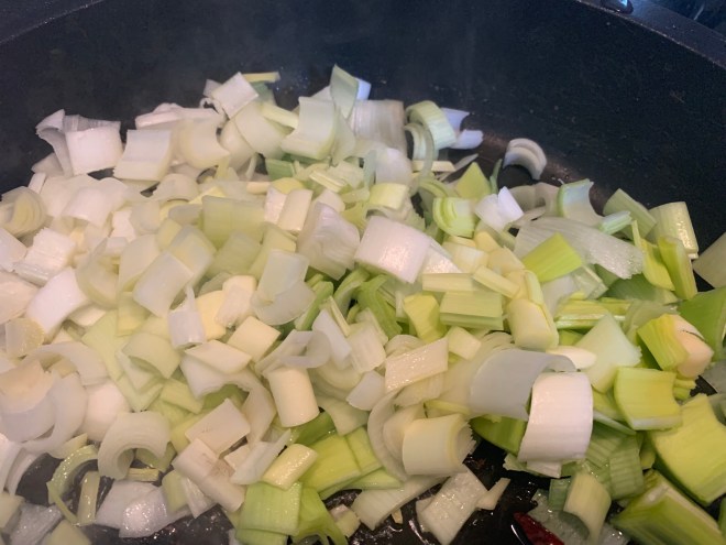 Cortamos lo verde de los puerros y las raìces y los cortamos por la mitad a lo largo. Los lavamos bien bajo el grifo y los cortamos en rodajitas. Los vamos agregando a la sartén. Añadimos la sal y dejamos que se pochen a fuego suave unos 15 minutos removiendo. Truquito acelerador para los puerros: añadir una pizca (menos de 1/4 de cucharadita!) de bicarbonato a la sartén.