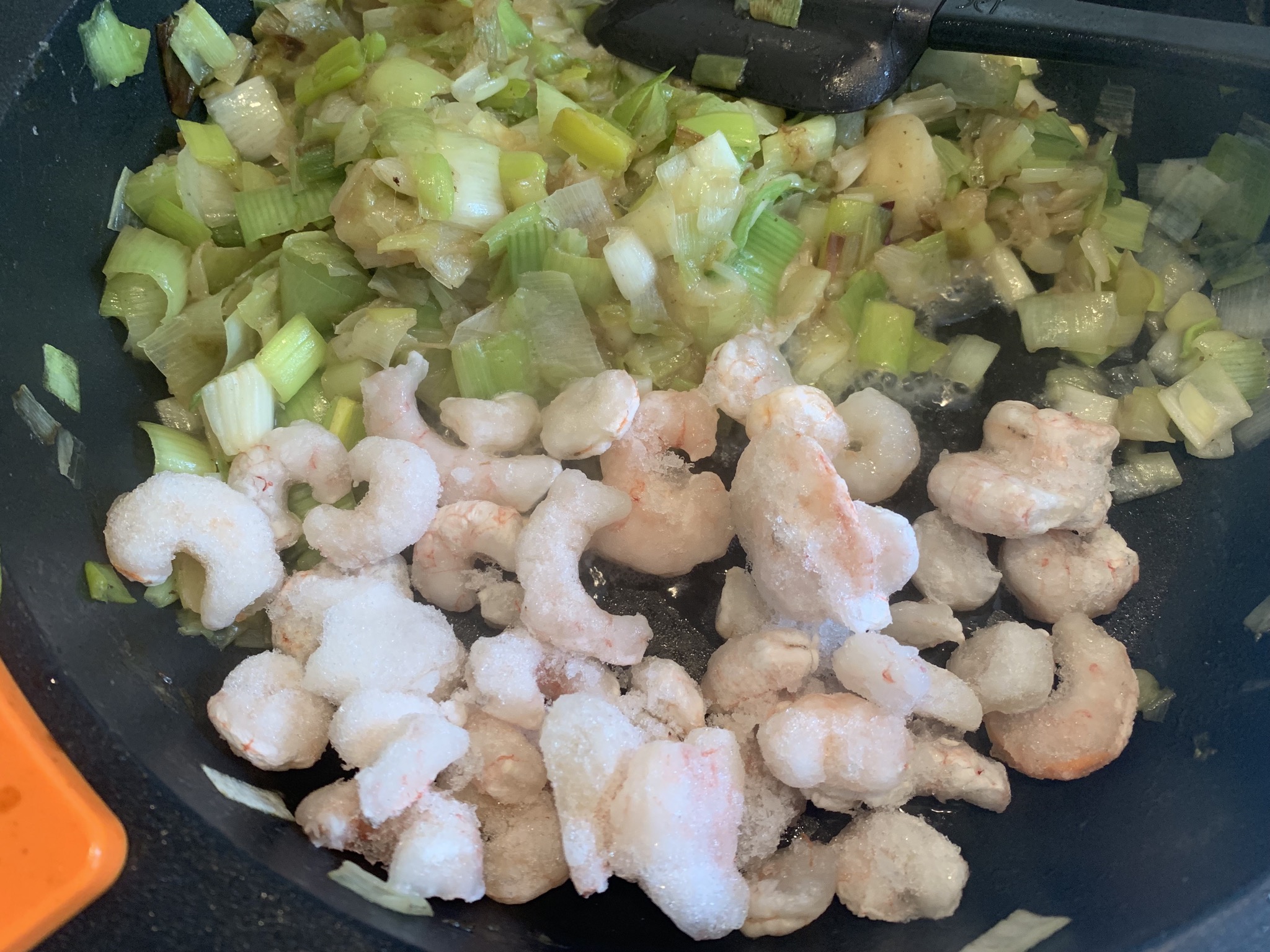 Una vez dorados, añadimos las gambas. No hace falta descongelarlas, pero como queráis.