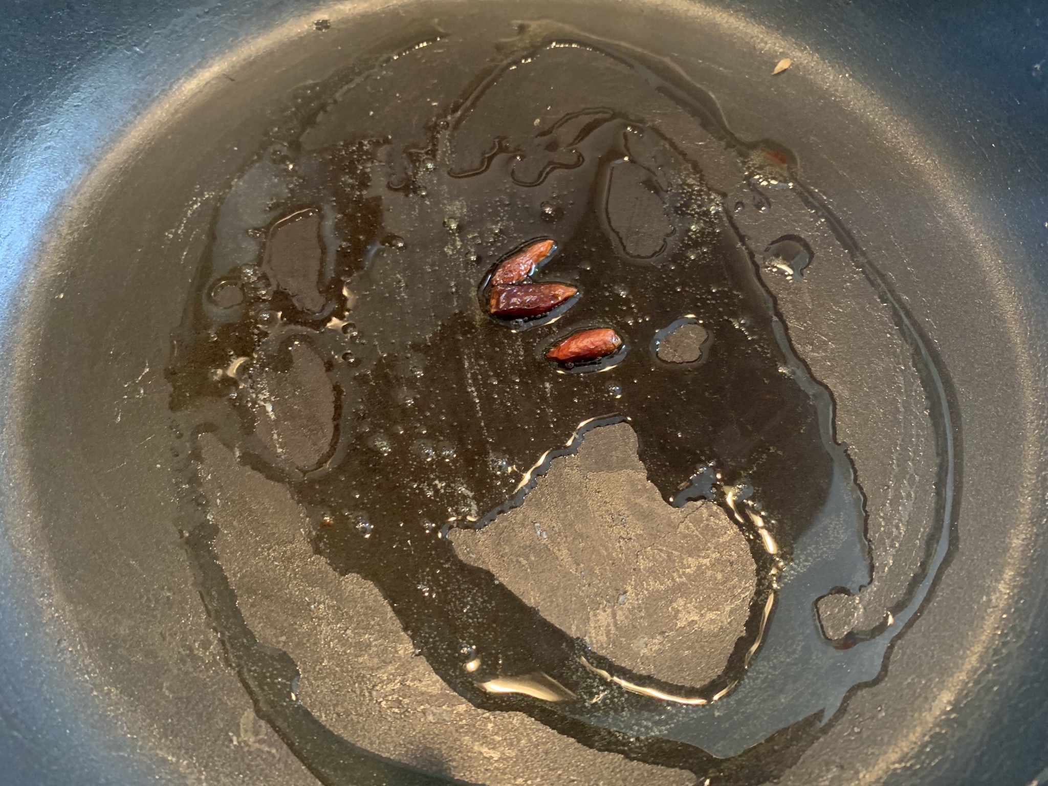 Ponemos un hilillo de aceite a calentar a fuego medio en una sartén amplia. Incorporamos las guindillas y/o el ajo si decidimos incluirlos – muy recomendable!
