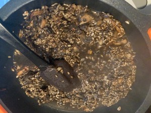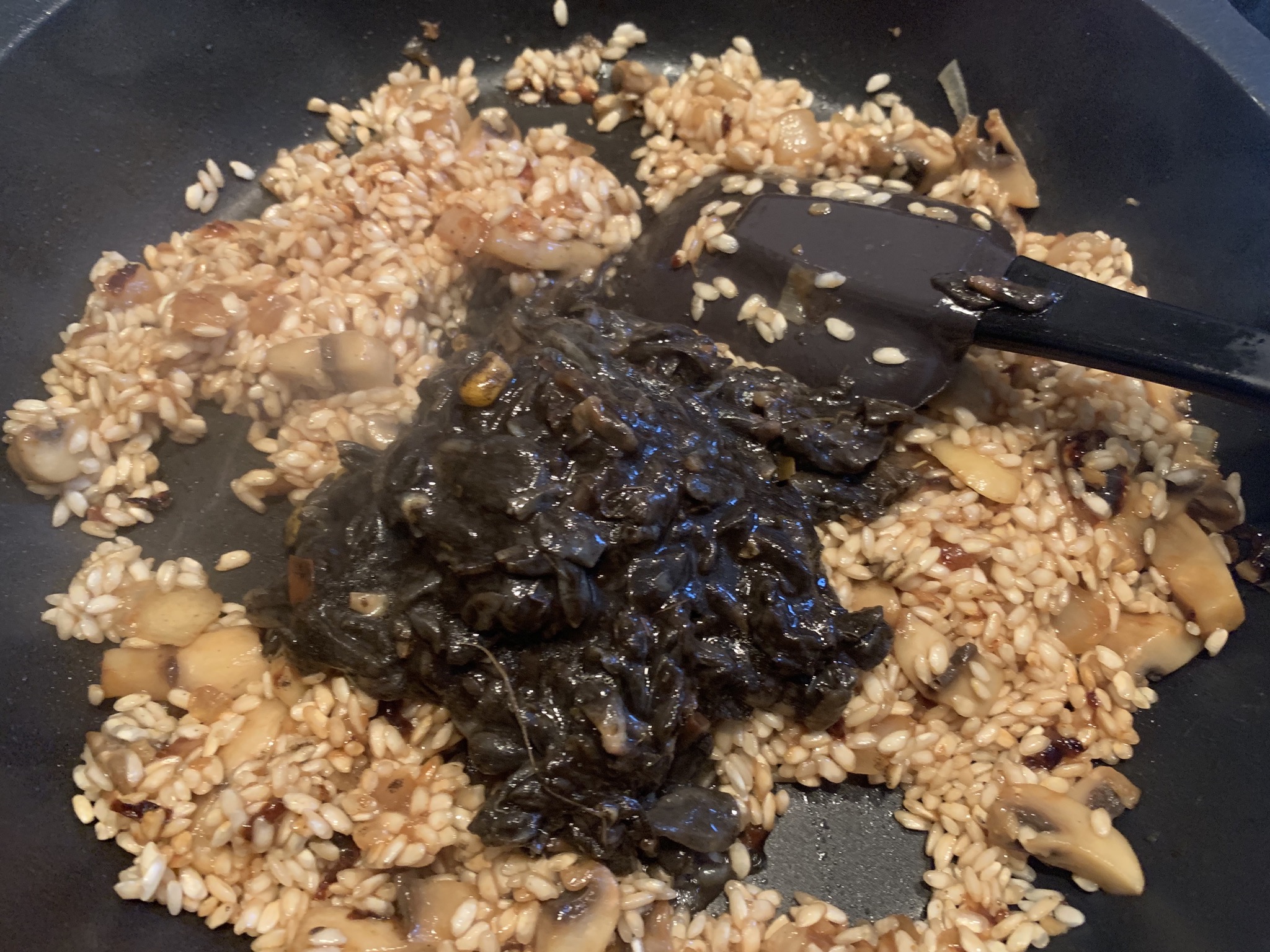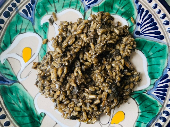 En cualquier caso, mi propuesta de hoy es fruto de la inspiración de un restaurante que estuve en Tulum. He partido de mi receta básica de risotto funghi y he añadido una lata de huitlacoche (que podéis encontrar en tiendas latinas o mexicanas como las que os indico en este link, y quizá en hipermercados).