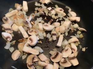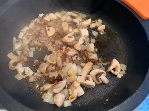 Lavamos bien los champiñones y los troceamos pequeños. Los añadimos a la cazuela y dejamos dorar 5 minutos.