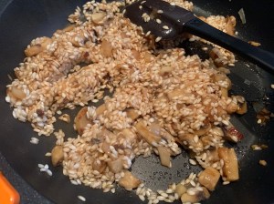 Cuando esté caliente, empezamos a agregar agua caliente (un cazo grande primero) y dejamos que vaya absorbiendo removiendo y agregando más hasta que los granos estén bien cocinados (tiempo a ojo, pero aprox 15-20 min).