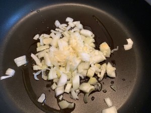 Comenzamos poniendo a calentar en una cazuela grandecita un chorro de aceite a fuego medio. Picamos los ajos (mejor con prensaajos) y la cebolla finita y los incorporamos a la cazuela. Los dejamos pochar 5 minutos tapados.