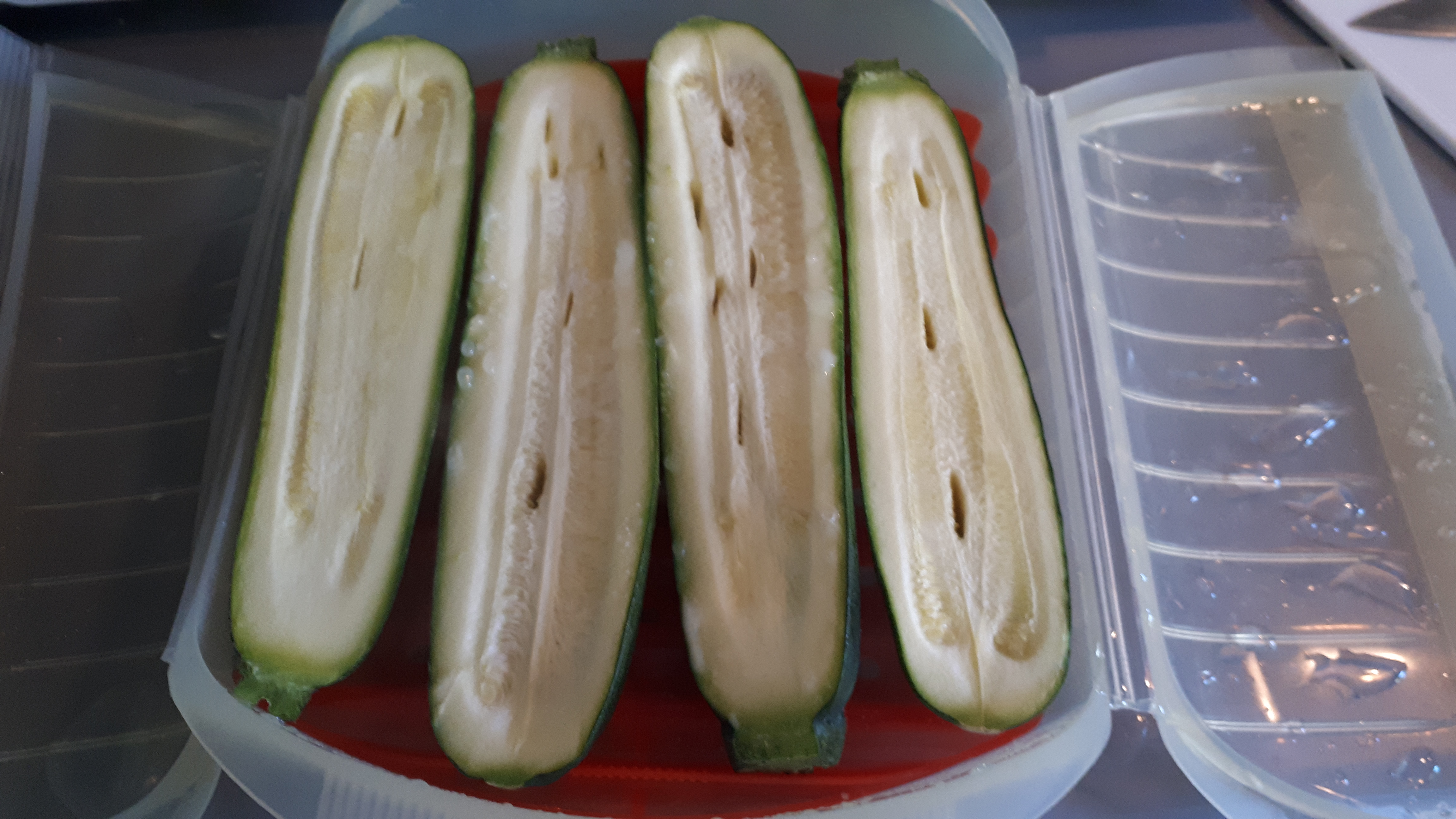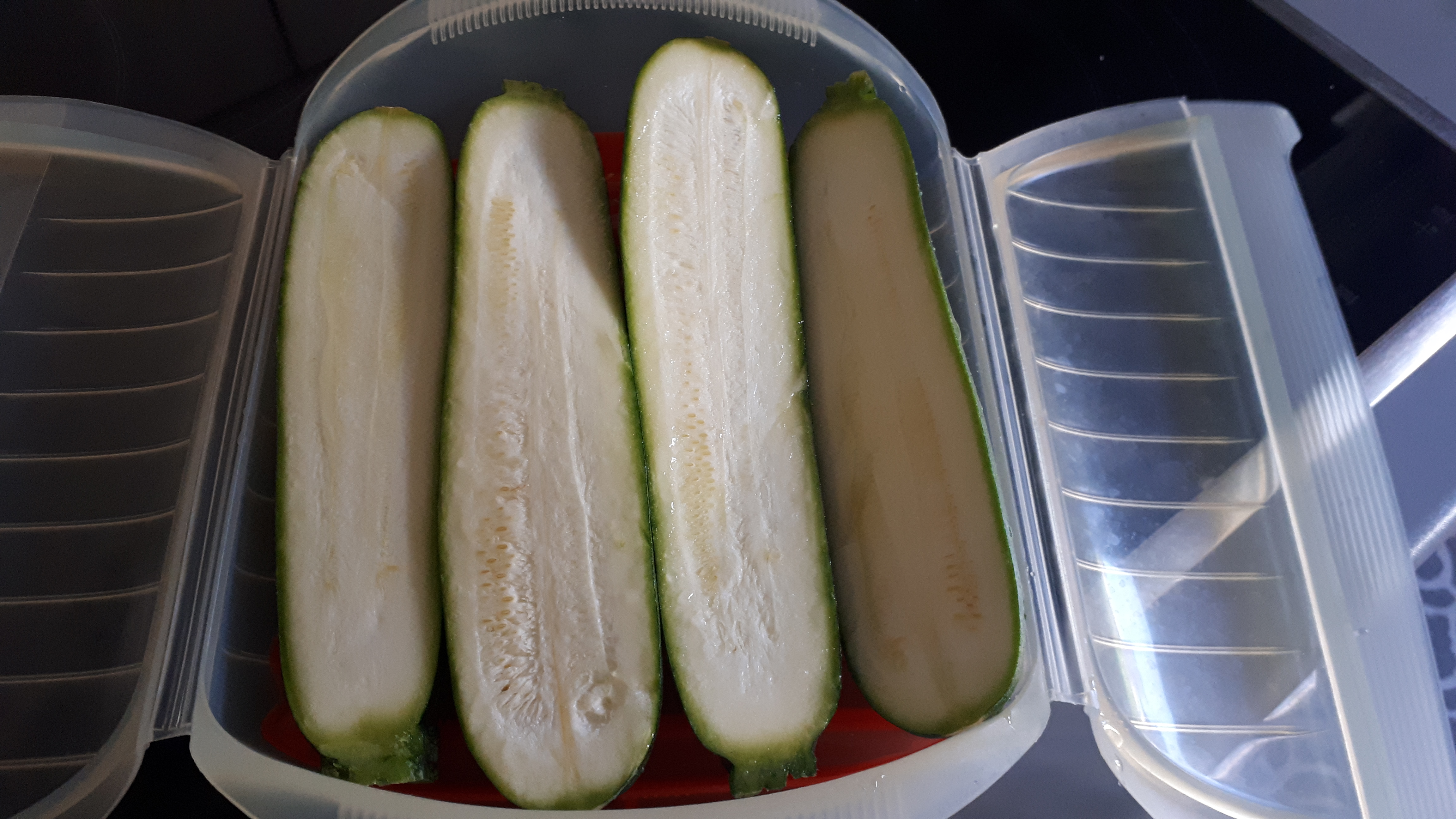 Comenzamos con los calabacines. Los lavamos y los cortamos por la mitad a lo largo. Lo más rápido para cocinarlos es hacerlos al vapor en el microondas, simplemente colocándolos en un estuche de vapor tipo Lekuee (sé que soy pesada con el uso de este utensilio, pero de verdad facilita muchísimo la cocina y reduce los tiempos una barbaridad!) y programando 6 minutos. Si no tenéis este tipo de estuche, colocáis los calabacines en una fuente apta para microondas, tapadita, y programáis 8-9 minutos.