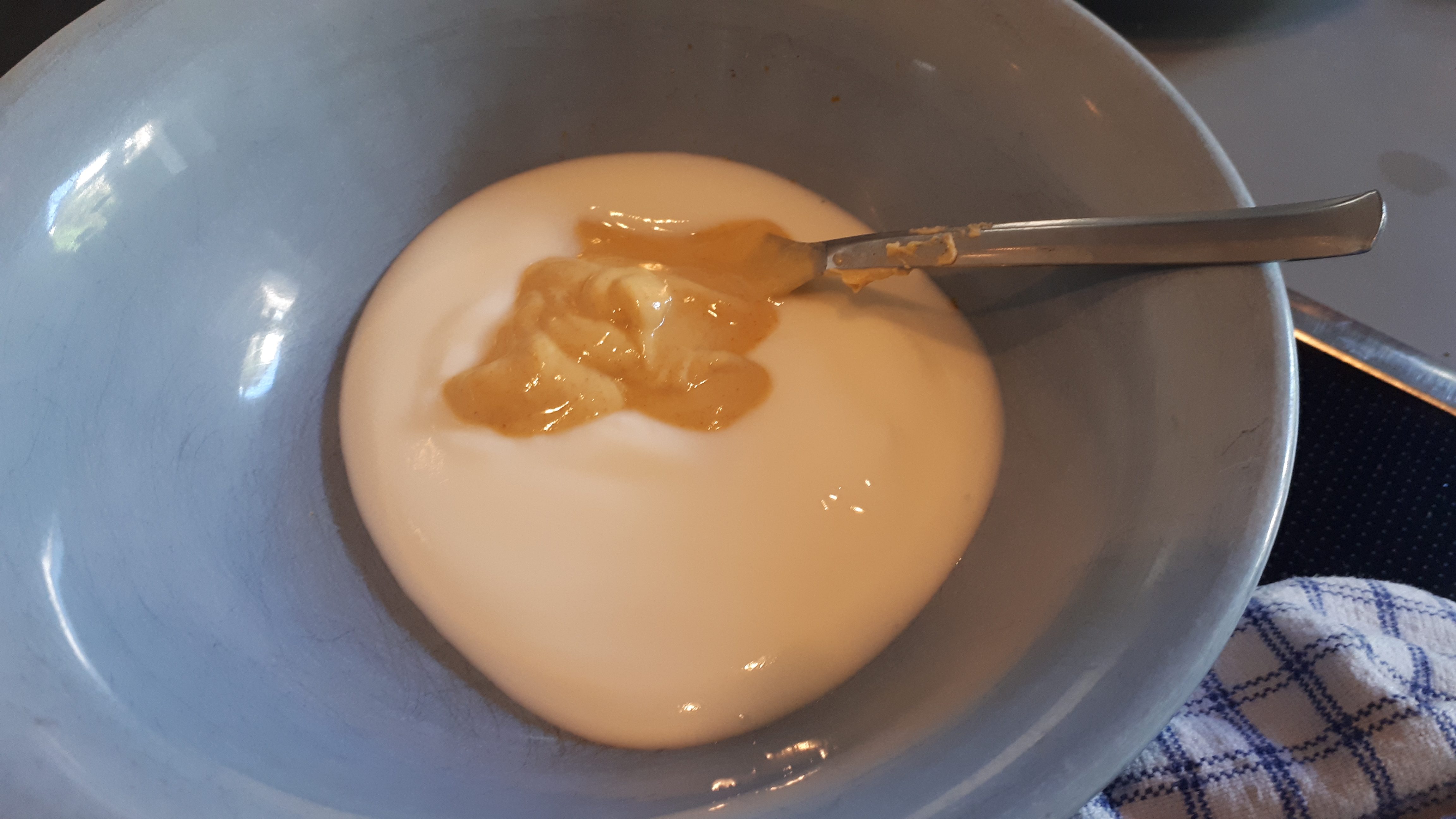 Mientras se cocina, en un cuenco grande mezclamos bien el yogur con la mostaza.