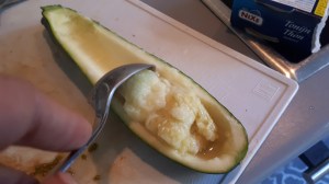 Cuando esté listo el calabacín, sacamos su pulpa con un cuchillo y una cuchara (con cuidado de que no se rompan, recordad que los vamos a rellenar!), picamos fina esa pulpa y la agregamos al bol con los demás ingredientes.