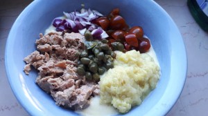 Lavamos y picamos el tomate y la cebolla pequeñitos y escurrimos bien las latas de atún. Los agregamos al cuenco anterior junto con las alcaparras.