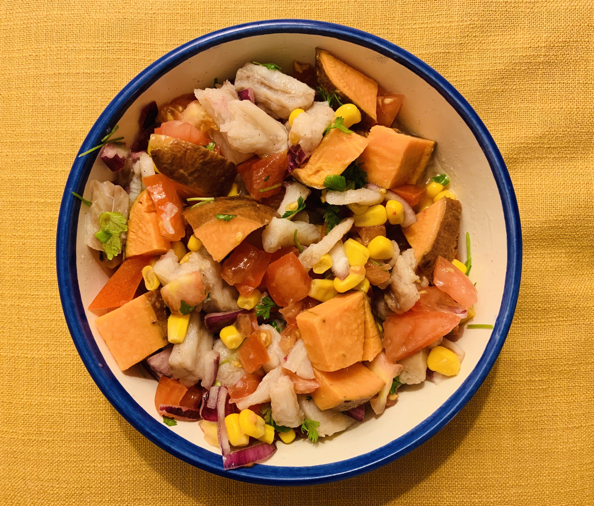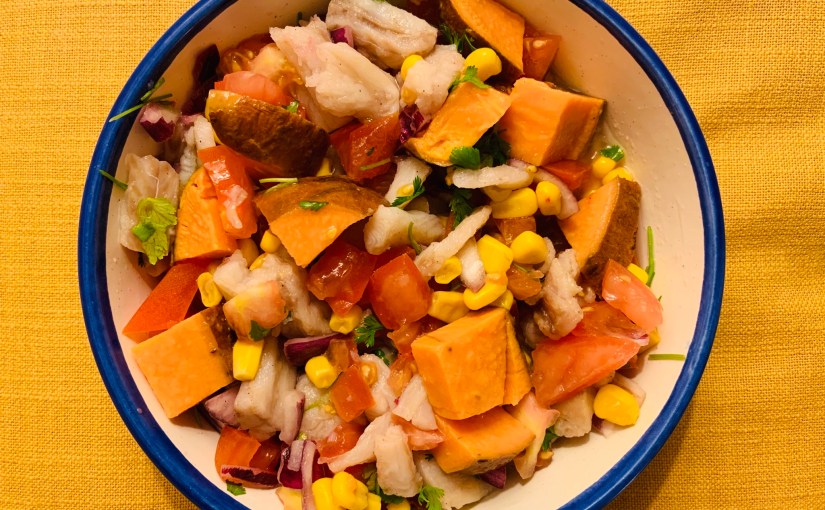 En mi último viaje a México probé sus deliciosos ceviches, y vi que todos tenían en común algunos ingredientes que yo no suelo incluir (os dejo aquí el link a toooodas mis recetas de ceviches, incluida una SIN crudos y otra VEGETARIANA!). Se trata del boniato, el maíz y el tomate. Además, me dijeron que suelen aligerar la salsa con un poco de agua y siempre siempre lo hacen con lima (no con limón, como sugiero en algunas de mis recetas). La consecuencia es un plato delicioso que os invito a probar lo antes posible!