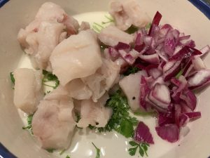 Exprimimos las limas en un cuenco o tupper grandecito y agregamos todos los ingredientes que habiamos preparado (menos el boniato). Salpimentamos y reservamos en la nevera durante una media hora (mejor no pasar de las 2horas).