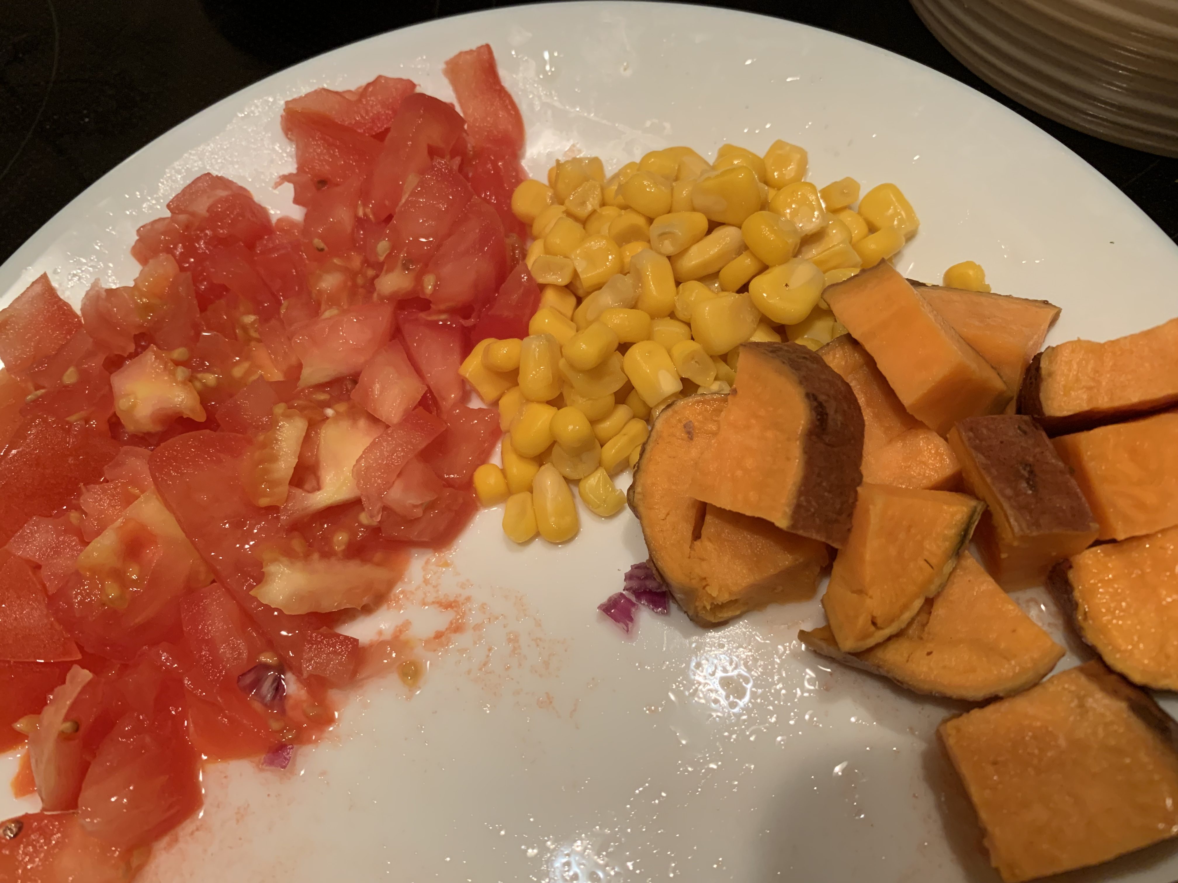 En el momento de servir, picamos muy fino el tomate y lo agregamos al cuenco con lo demás, así como el maíz y el boniato cocinado.
