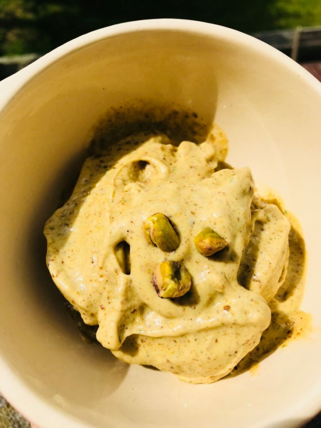 • 1 vaso lleno de pistachos (crudos, sin cascara), o 3 cucharadas soperas de manteca de pistacho (la venden en algunos herbolarios y online, como si fuese manteca de cacahuete pero de pistacho)