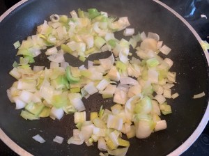 Comenzamos cortando el puerro por la mitad a lo largo y desechando la raíz y la parte verde. Lo lavamos muy bien, ya que suele tener tierra por el centro. Lo troceamos pequeño.