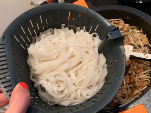 - 200-300 gr de tallarines anchos de arroz (también llamados «de pad thai», si no, cualquier tipo de tallarines valdría)