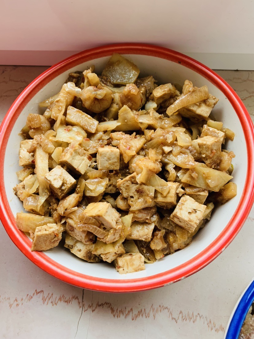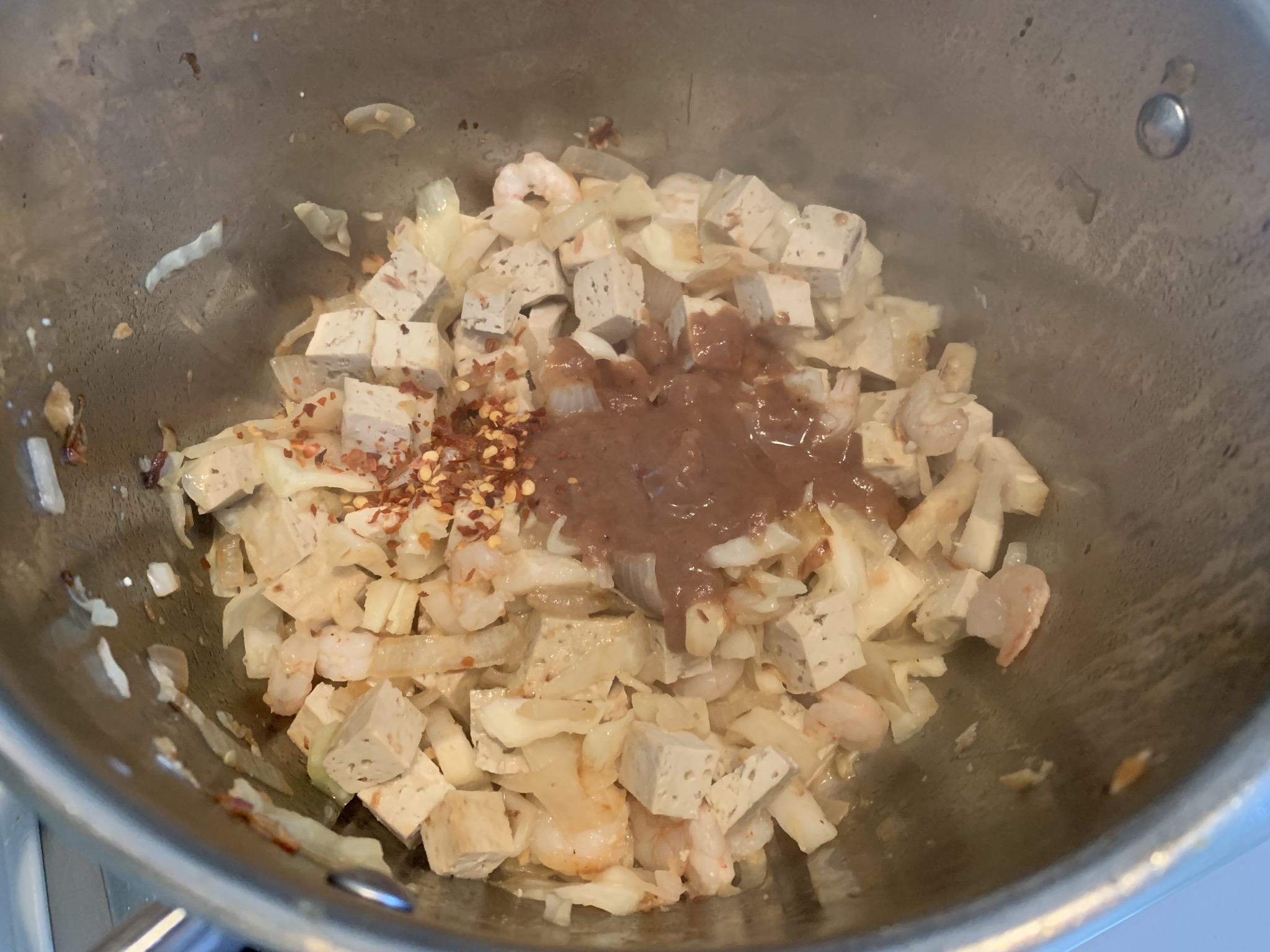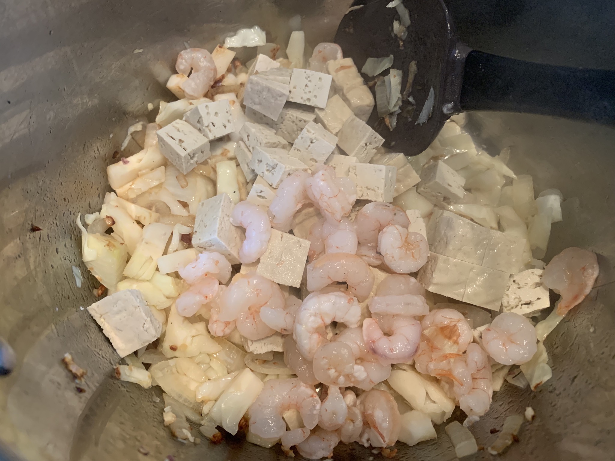 Agregamos el pollo o tofu cortado en daditos y las gambas descongeladas. Salpimentamos ligeramente y dejamos que se doren un par de minutos, removiendo de vez en cuando.
