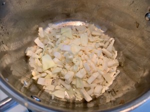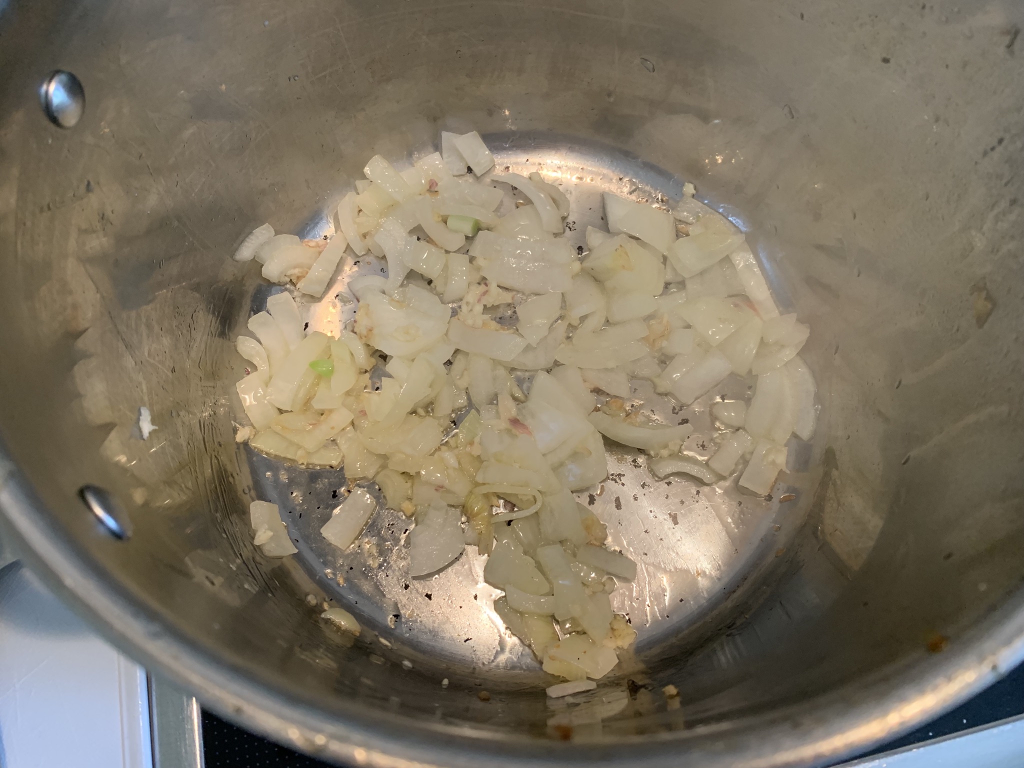 A continuación, tomamos una cazuela u olla grande y ponemos un chorro de aceite de oliva a calentar a fuego medio. Pochamos la cebolla y el ajo picados muy pequeños, durante 7 minutos. Salpimentamos.