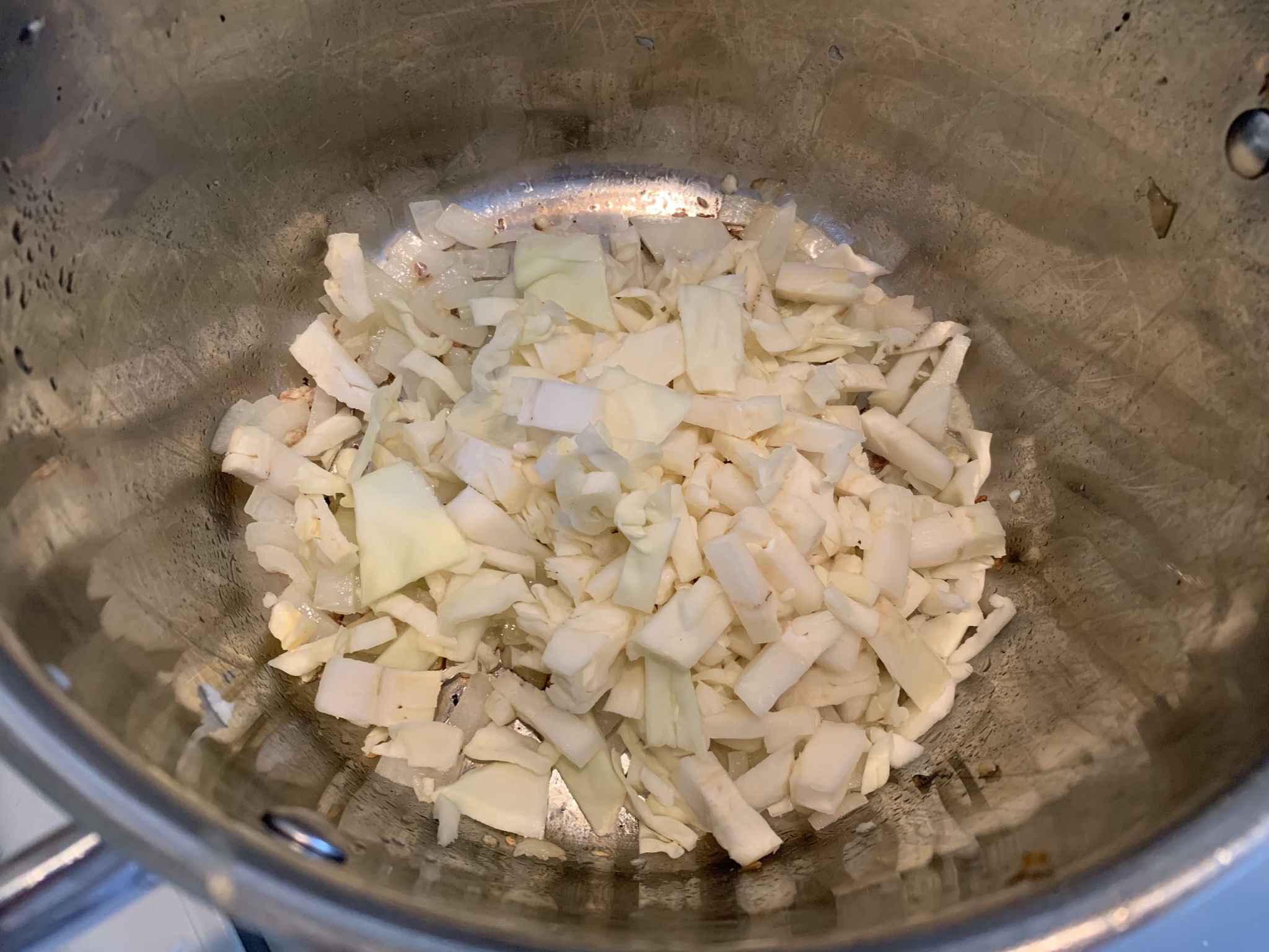 Agregamos el repollo/col picado muy pequeño también, y lo rehogamos a fuego fuerte unos 5 minutos más.