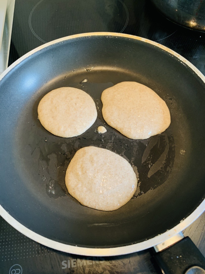 Engrasamos un poco una sartén antiadherente (con mantequilla por ejemplo) y cuando esté muy caliente vertemos masa dejando que quede redondita. En una sartén mediana (tipo tortilla de patata) podremos hacer 3 tortitas a la vez.