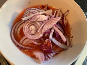 Mientras, preparamos la cebolla marinada, que le da un toque fresco y crujiente espectacular! Simplemente la cortamos en aritos (con cuchillo o con mandolina), exprimimos la naranja y las limas y mezclamos ambas cosas en un cuenco junto con la sal y el picante (si decidimos incluirlo).