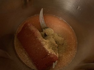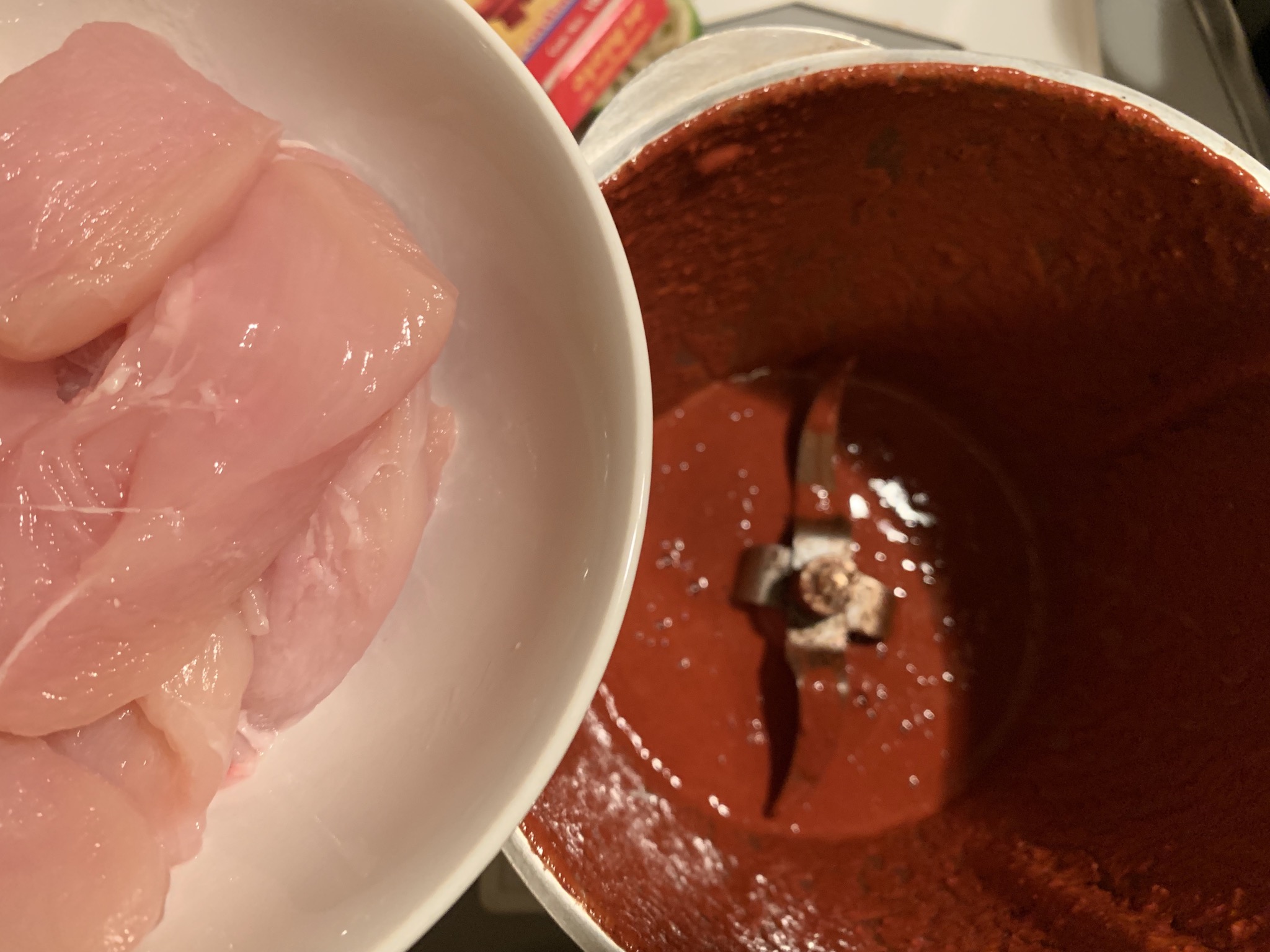 Comenzamos preparando el adobo del pollo. Para ello, simplemente mezclamos en un cuenco o thermomix todos los ingredientes indicados “Para el adobo” y trituramos bien hasta que quede una pasta líquida. Yo lo hice con thermomix 30 segundos a velocidad 6.