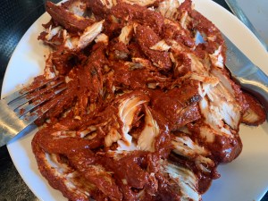 Cuando esté listo el pollo, lo deshilachamos con cuchillo y tenedor.