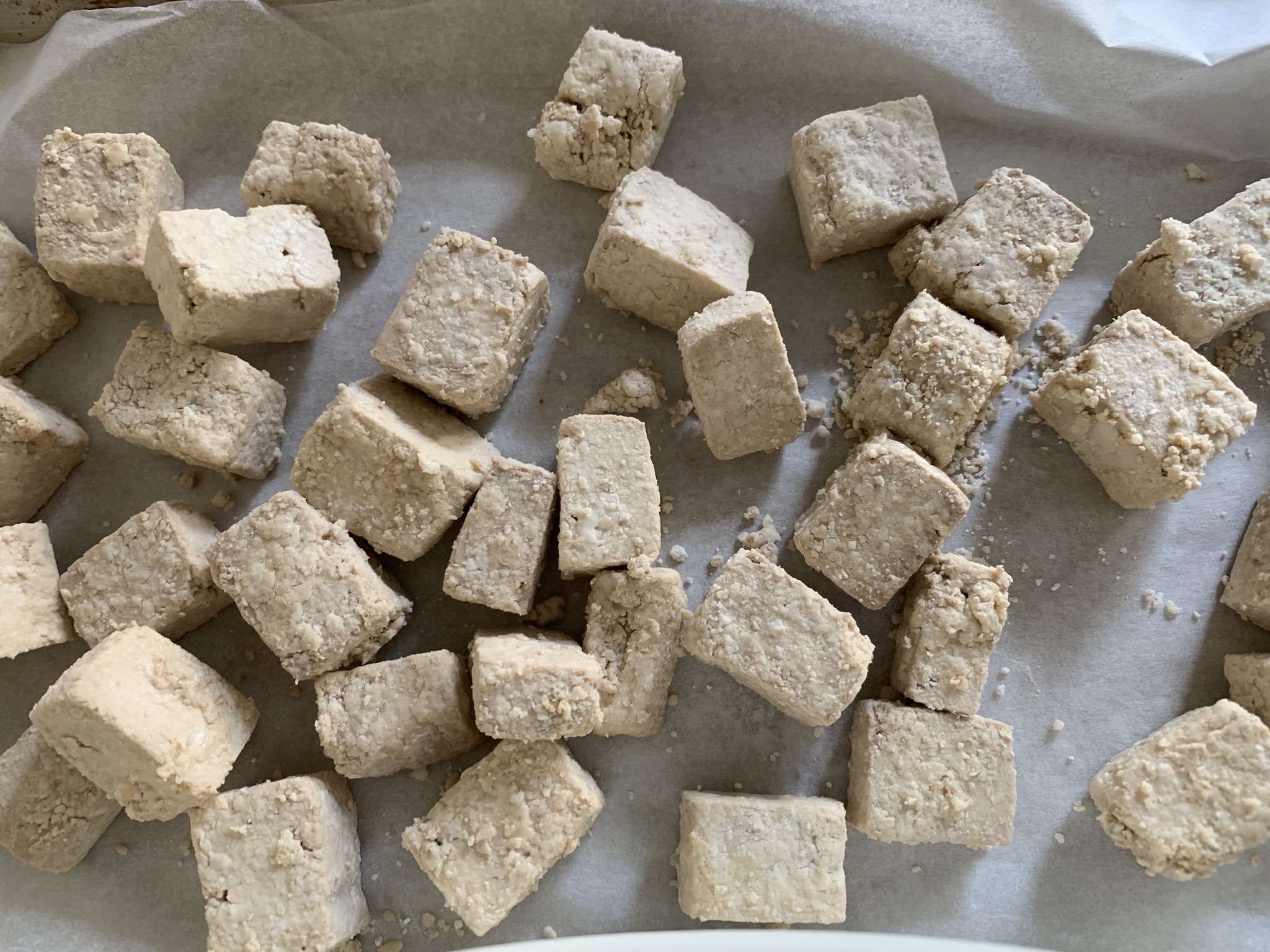 Colocamos el tofu esparcido sobre una bandeja cubierta con papel de horno y horneamos durante 15 minutos.