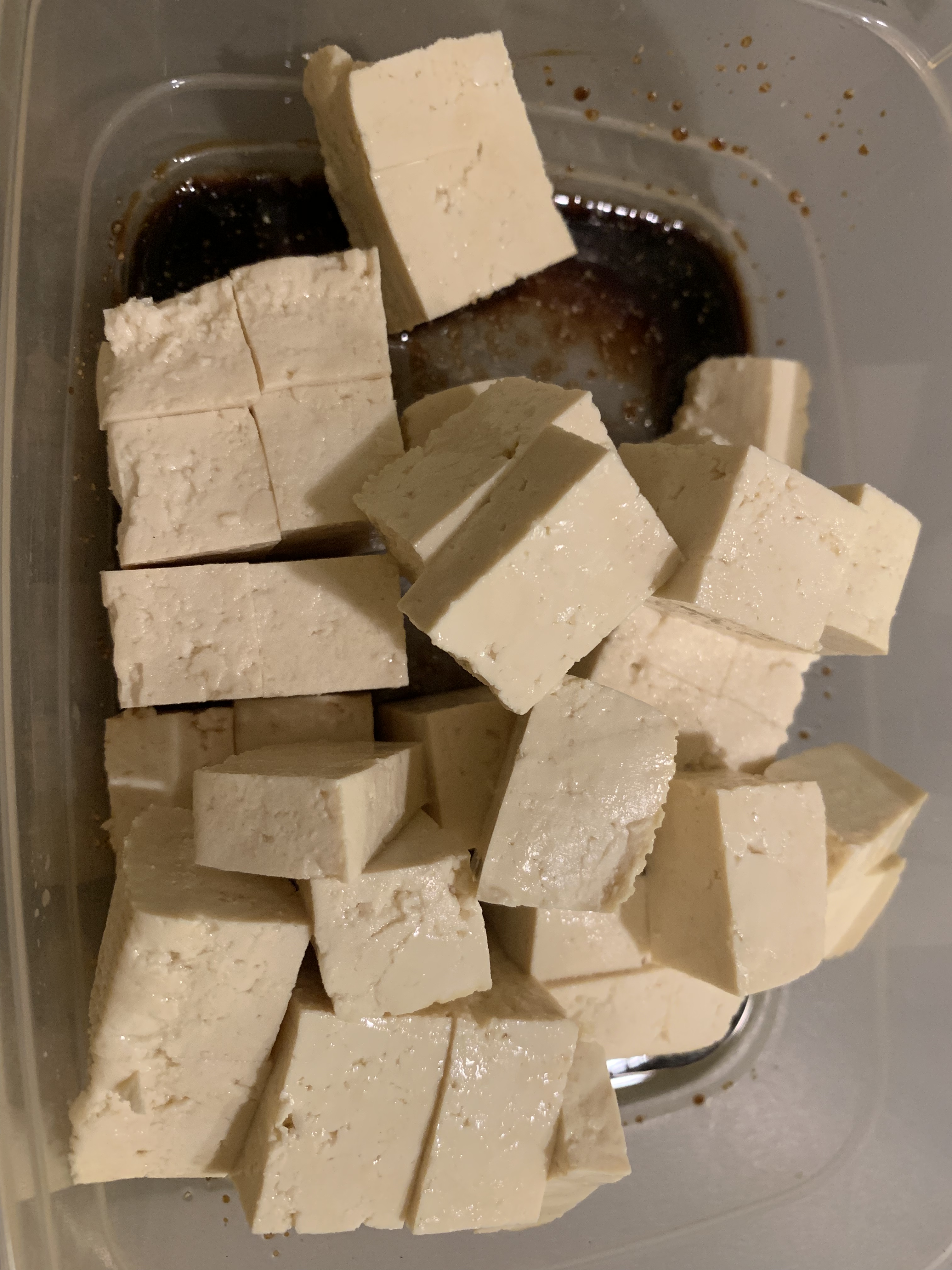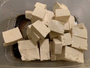Troceamos el tofu en dados de 2 dedos aproximadamente y los incorporamos a ese tupper.