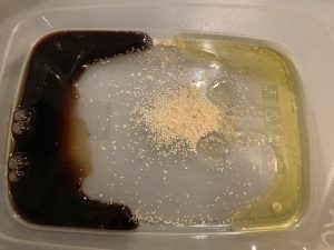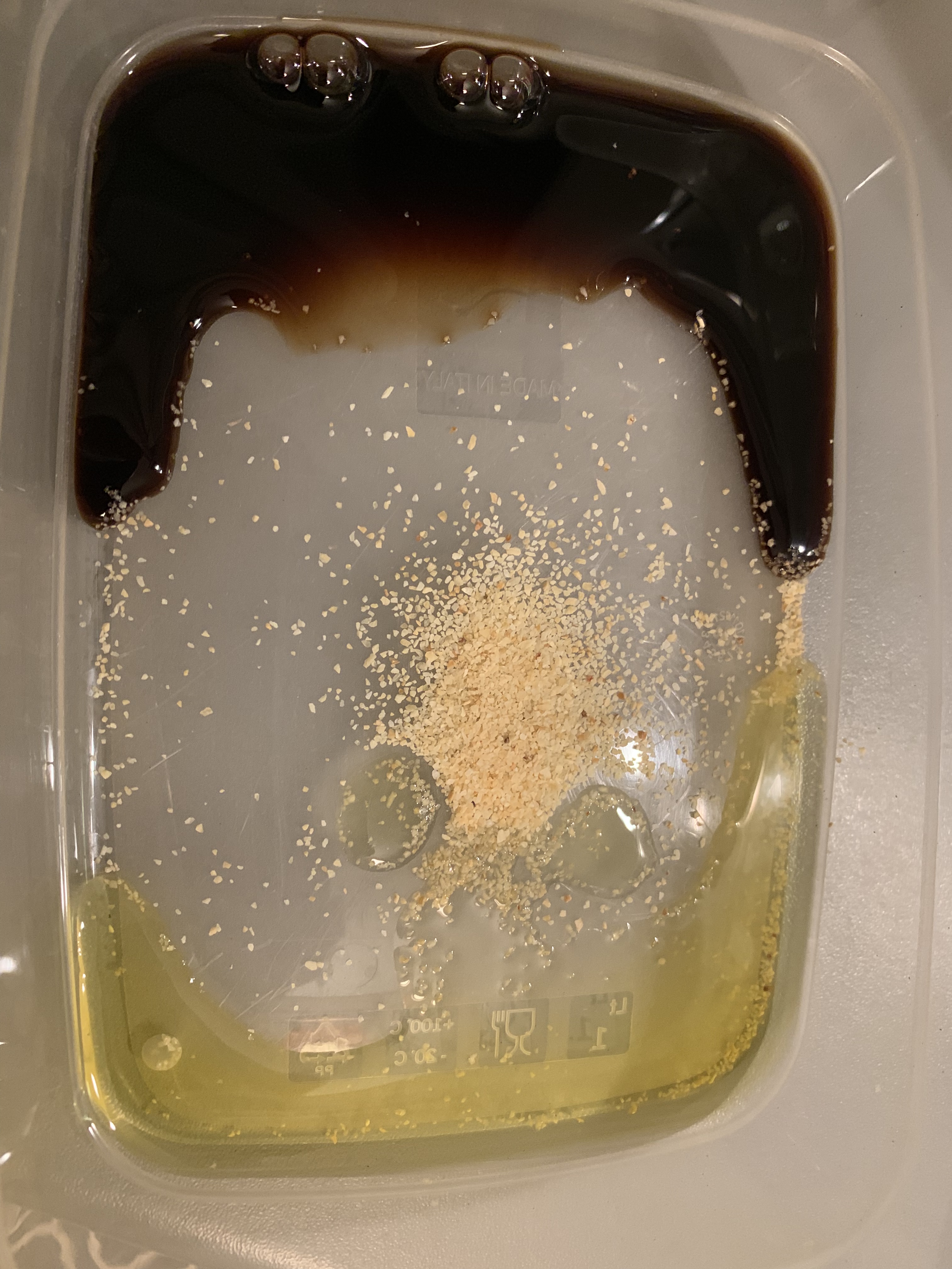 Comenzamos poniendo en un tupper todos los ingredientes de listado menos el tofu y la maizena. Removemos un poco.