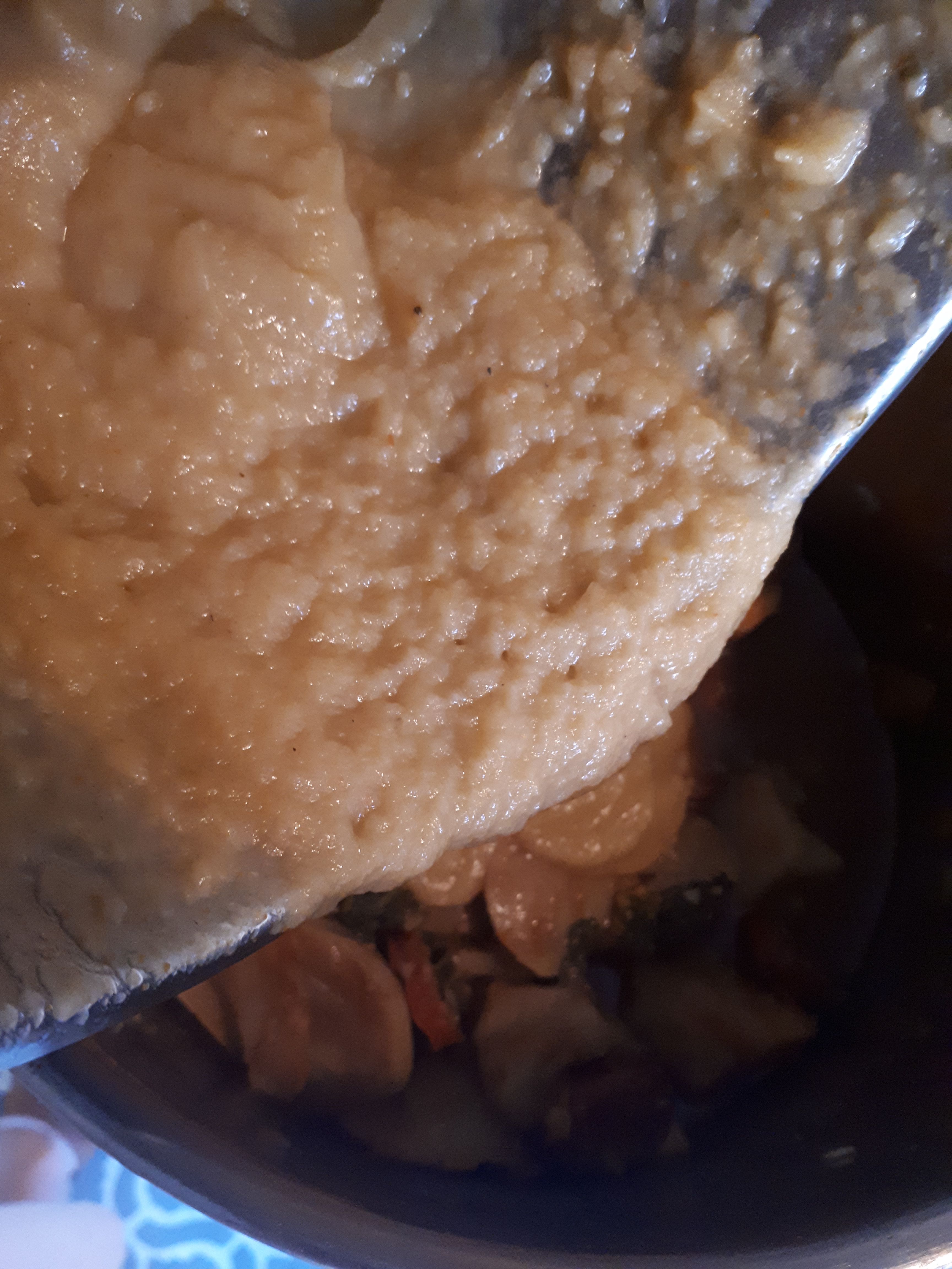 Sacamos 2 cazos de patatas con su líquido y trituramos bien. Lo incorporamos a la cazuela de nuevo.