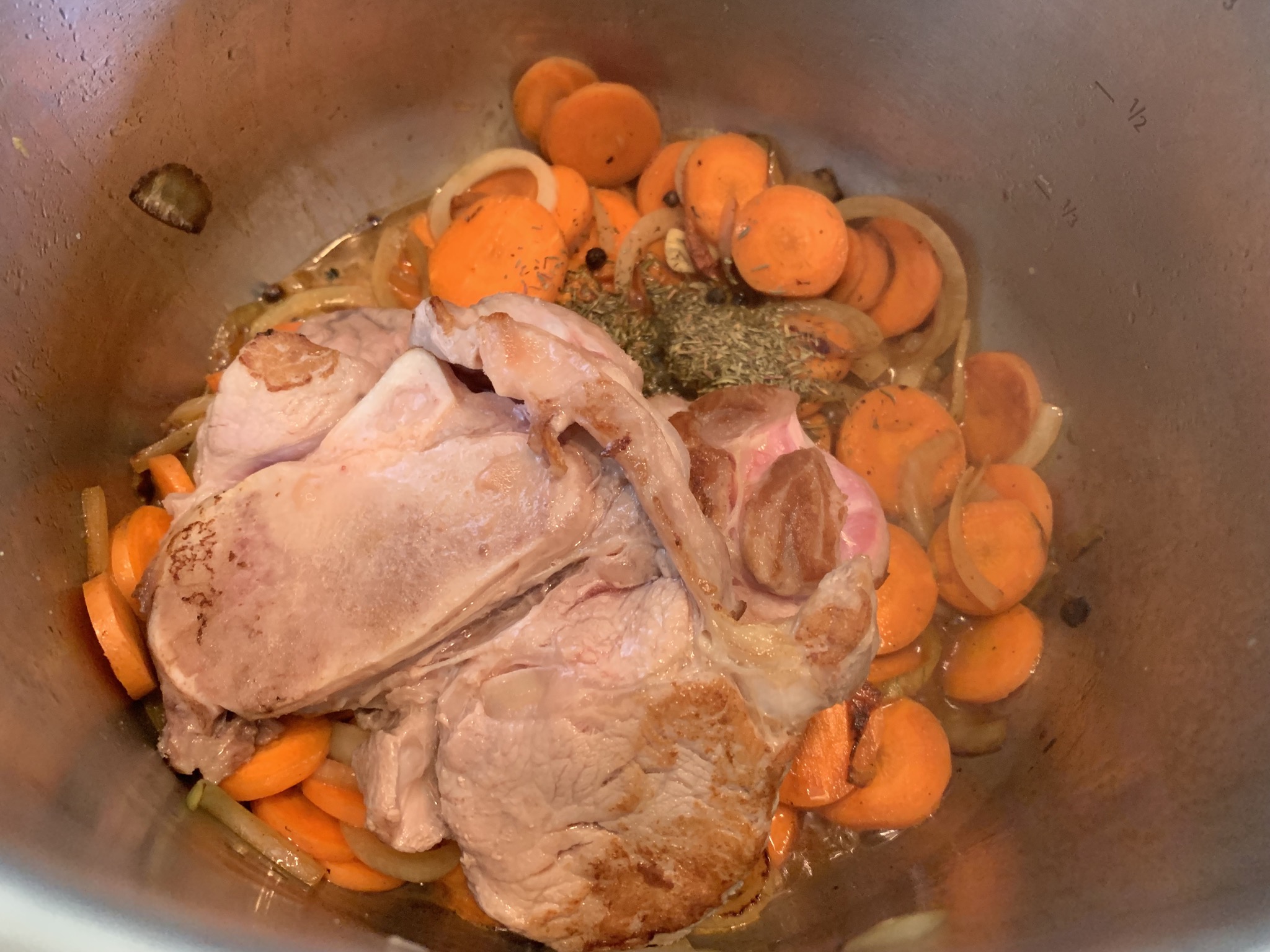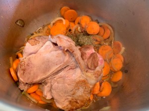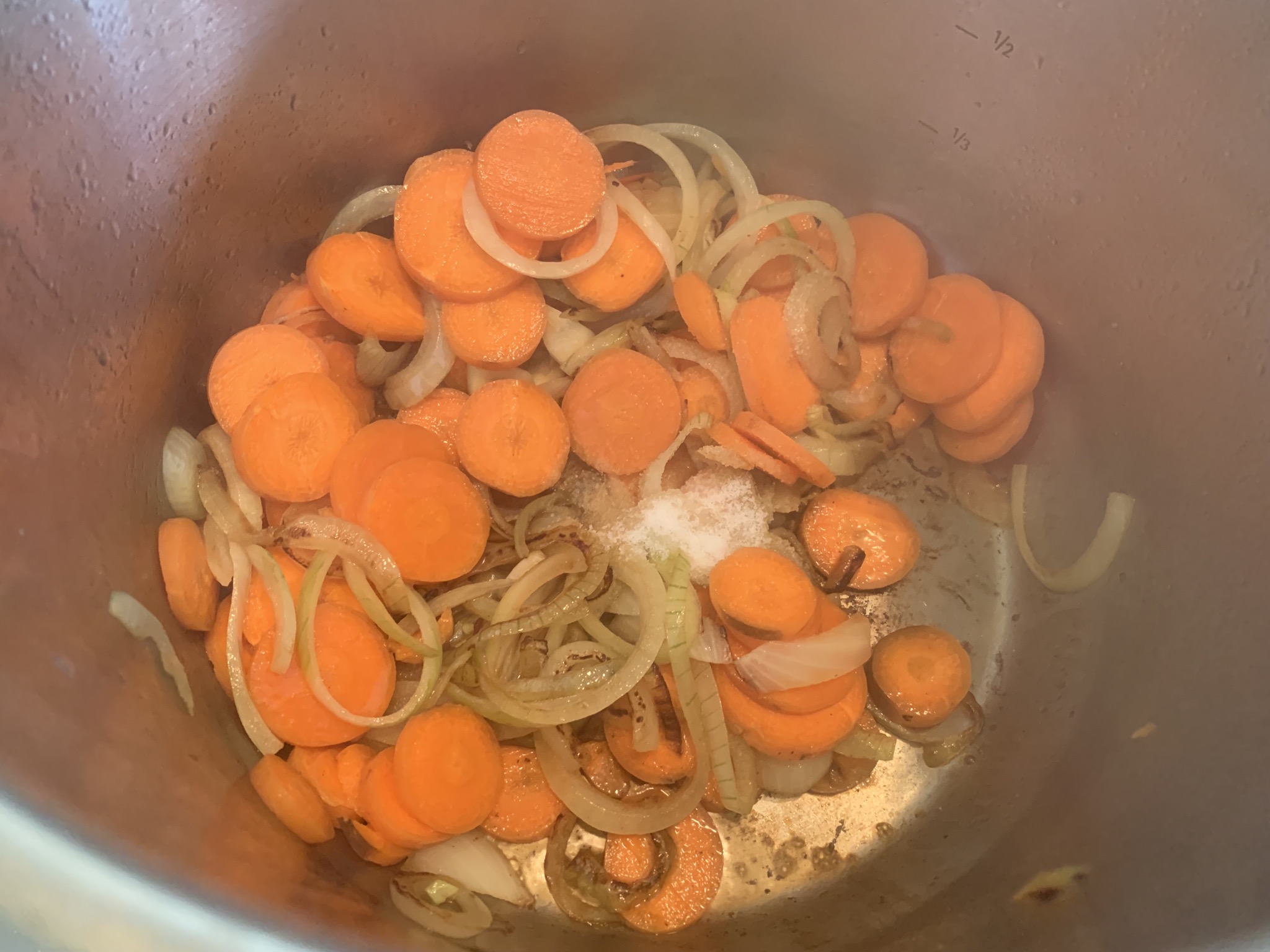 Pelamos y picamos pequeños la cebolla, los ajos y las zanahorias y los ponemos a pochar en el mismo aceite y olla/cazuela donde hemos hecho la carne (si quedaba poco aceite, ponemos mas).