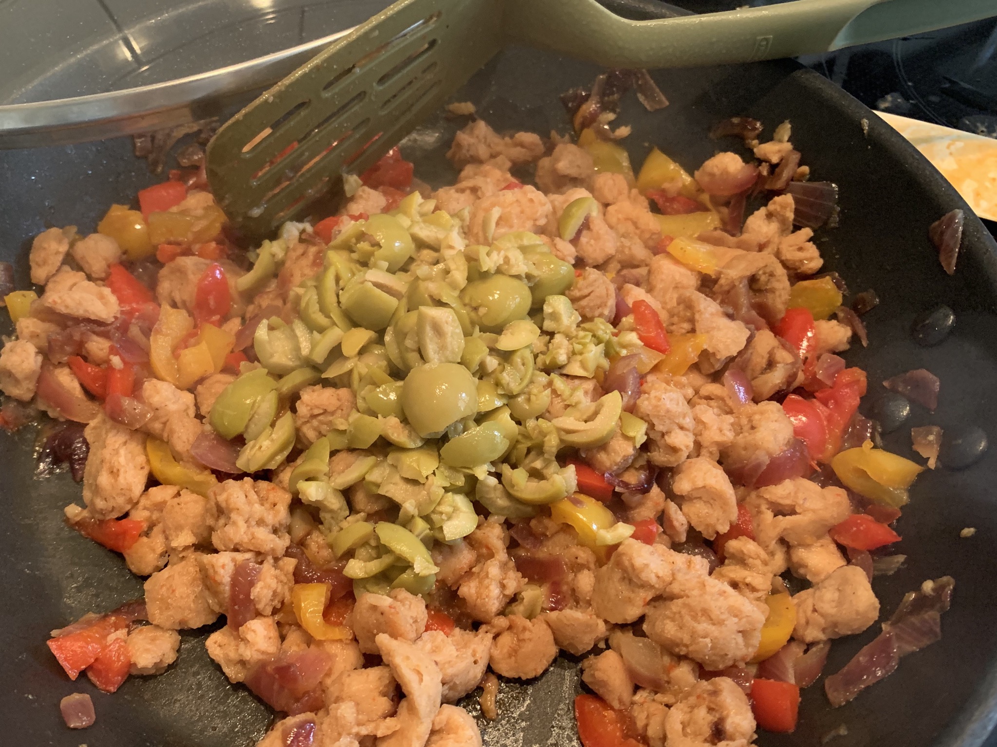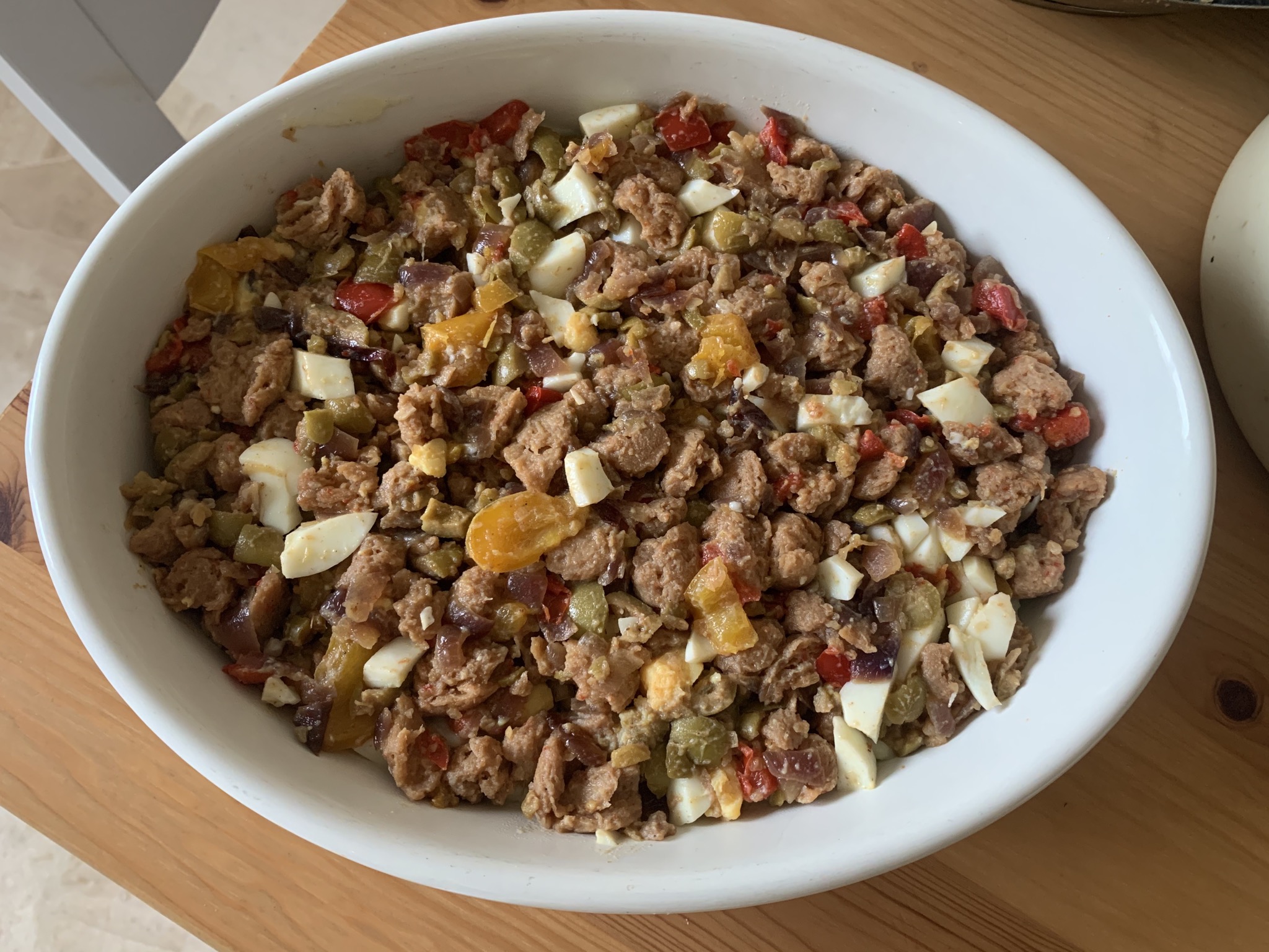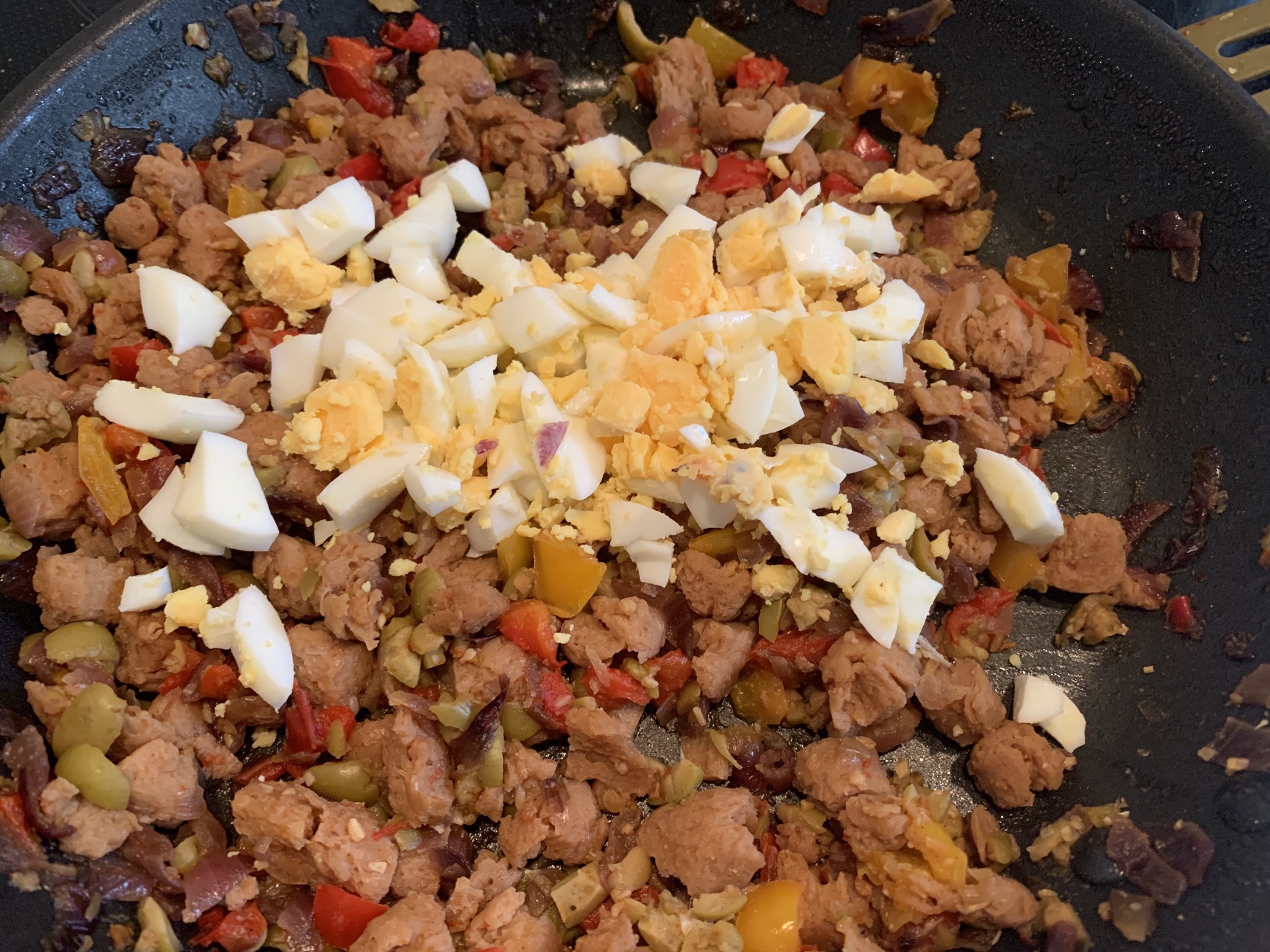 - Picamos las aceitunas y el huevo duro y las añadimos a la mezcla anterior, ya fuera del fuego.