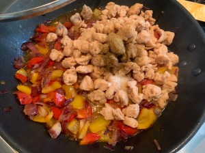 - Cuando estén dorados (10 minutos aprox), añadimos la carne/soja, sal, comino y pimienta y doramos a fuego fuerte 5 minutos removiendo de vez en cuando.