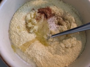 Comenzamos preparando el puré de patata. Como os indicaba arriba, podéis hacerlo con patatas naturales simplemente cociéndolas en abundante agua con sal hasta que estén blanditas. Personalmente, me gusta mucho el resultado del puré deshidratado y además es un 99% patata, por tanto es un procesado que me convence 🙂 . Para hacerlo, calentamos el agua y la leche en el microondas o en un cazo y vertemos (ya fuera del fuego) los polvitos. Removemos con un tenedor y agregamos los demás ingredientes del puré sin dejar de remover. Lo dejamos reposar mientras preparamos la parte del relleno.