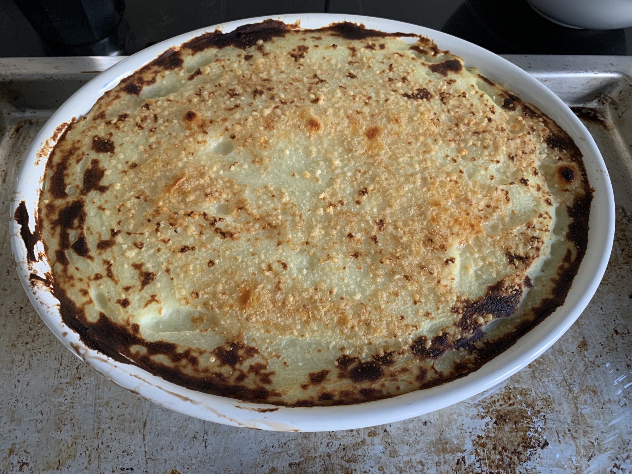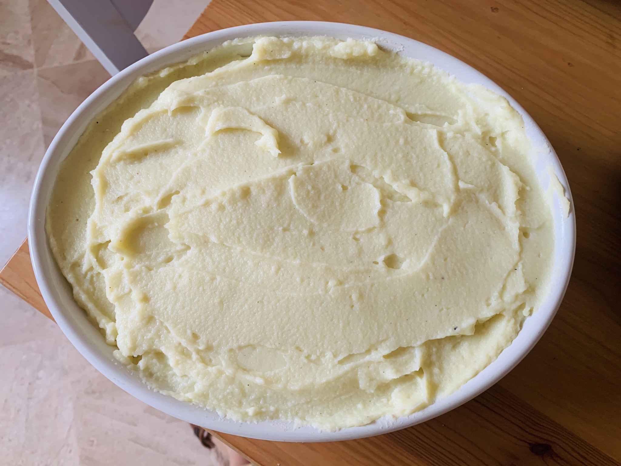 En una fuente apta para horno (también podría ser un molde alargado, pero tened en cuenta que se sirve tal cual, no se desmolda), ponemos una capa de puré, por encima repartimos todo el relleno y por ultimo terminamos con el resto del puré.