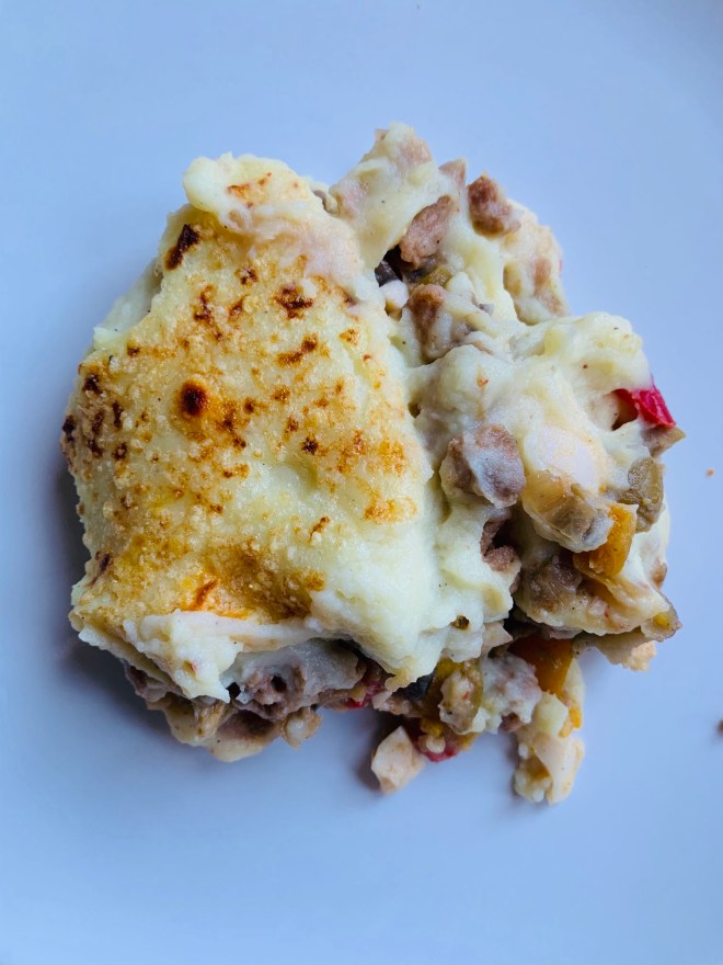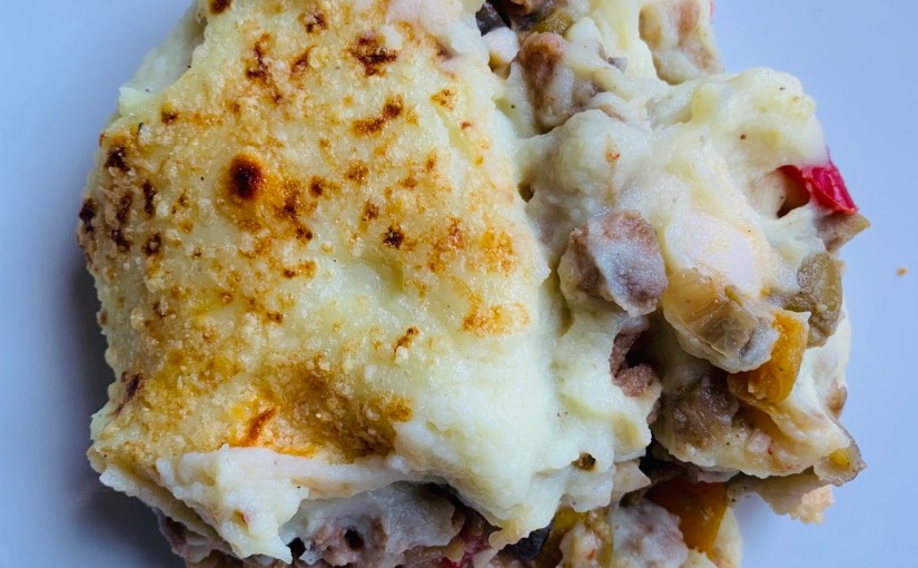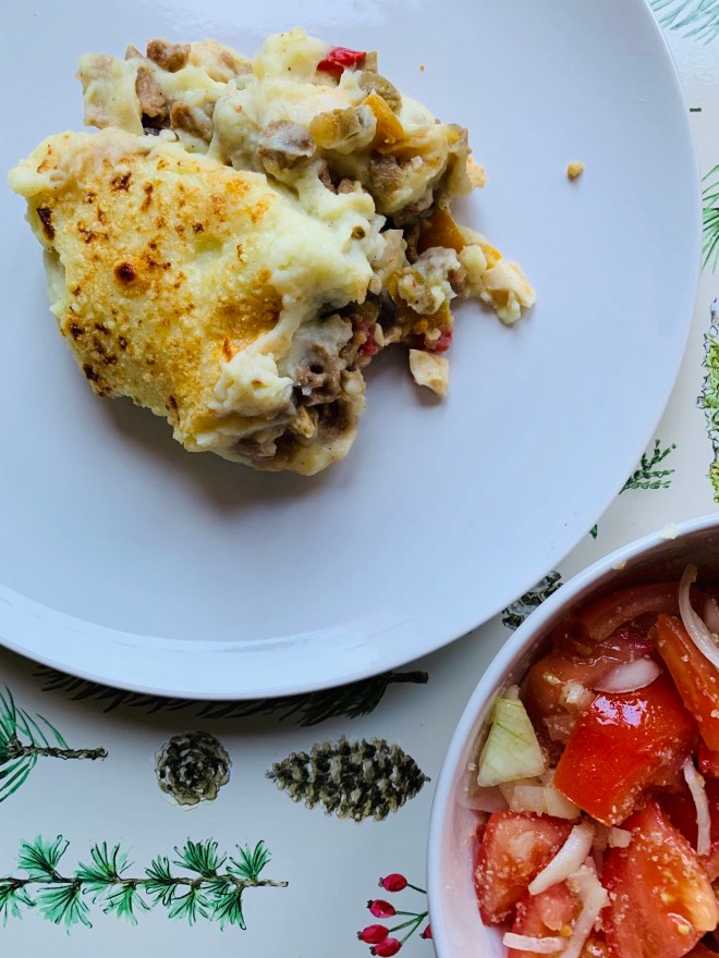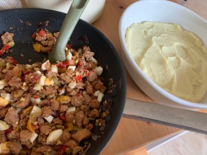 Hay uno que mi madre solía preparar bastante cuando era pequeña, como cena rápida o comida de diario, y que nos requeté-chiflaba: tenía puré de patata, atún y tomate frito. Fíjate qué simple, pero nos peleábamos por repetir! En este blog he publicado varios de ese estilo: con cordero, con carne picada tipo bolognesa, y por supuesto el de atún. Fuera del blog quizá los hayáis oído con los nombres de shepherd’s pie, cottage pie y fisherman’s pie, respectivamente.