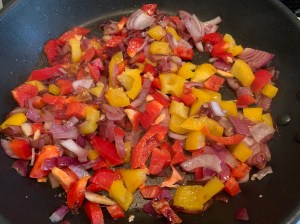 - Picamos la cebolla, el ajo y el pimiento pequeñitos y los pochamos en una sartén o cazuela amplia con un chorro de aceite a fuego medio.