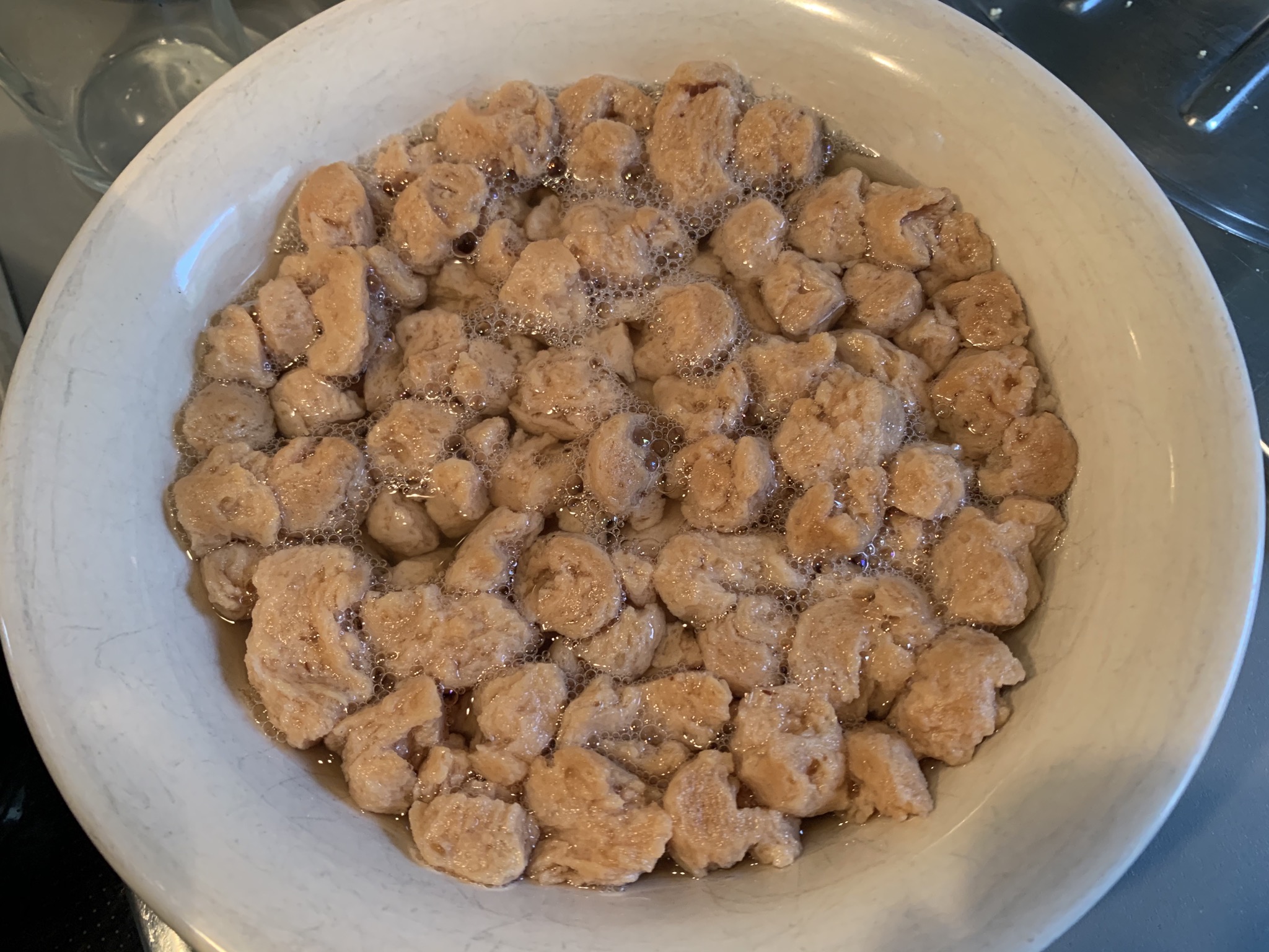 - Por otro lado, si vamos a usar soja texturizada en lugar de carne, la ponemos a hidratar en un cuenco con agua muy caliente (o hirviendo) mientras se hace lo demás.