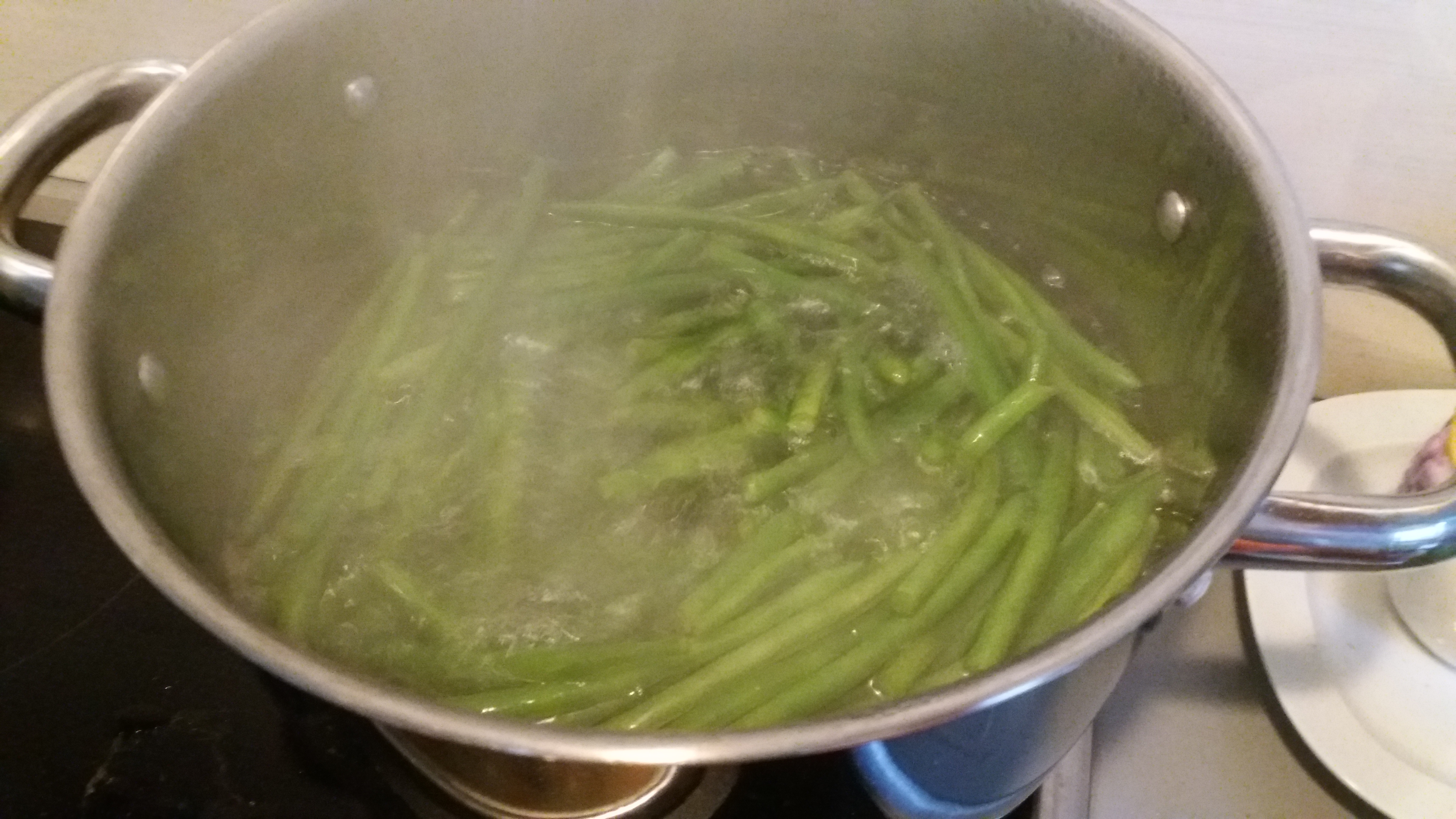 Bajamos a fuego medio y dejamos hasta que estén casi tiernas, momento en el cual incorporamos las judías. Dejamos hasta que estén al dente (luego seguirán cocinándose un poco más). Unos 7-10 minutos. También podemos hacer ambas al vapor con un estuche tipo Lekue o en cestillo de la olla express.