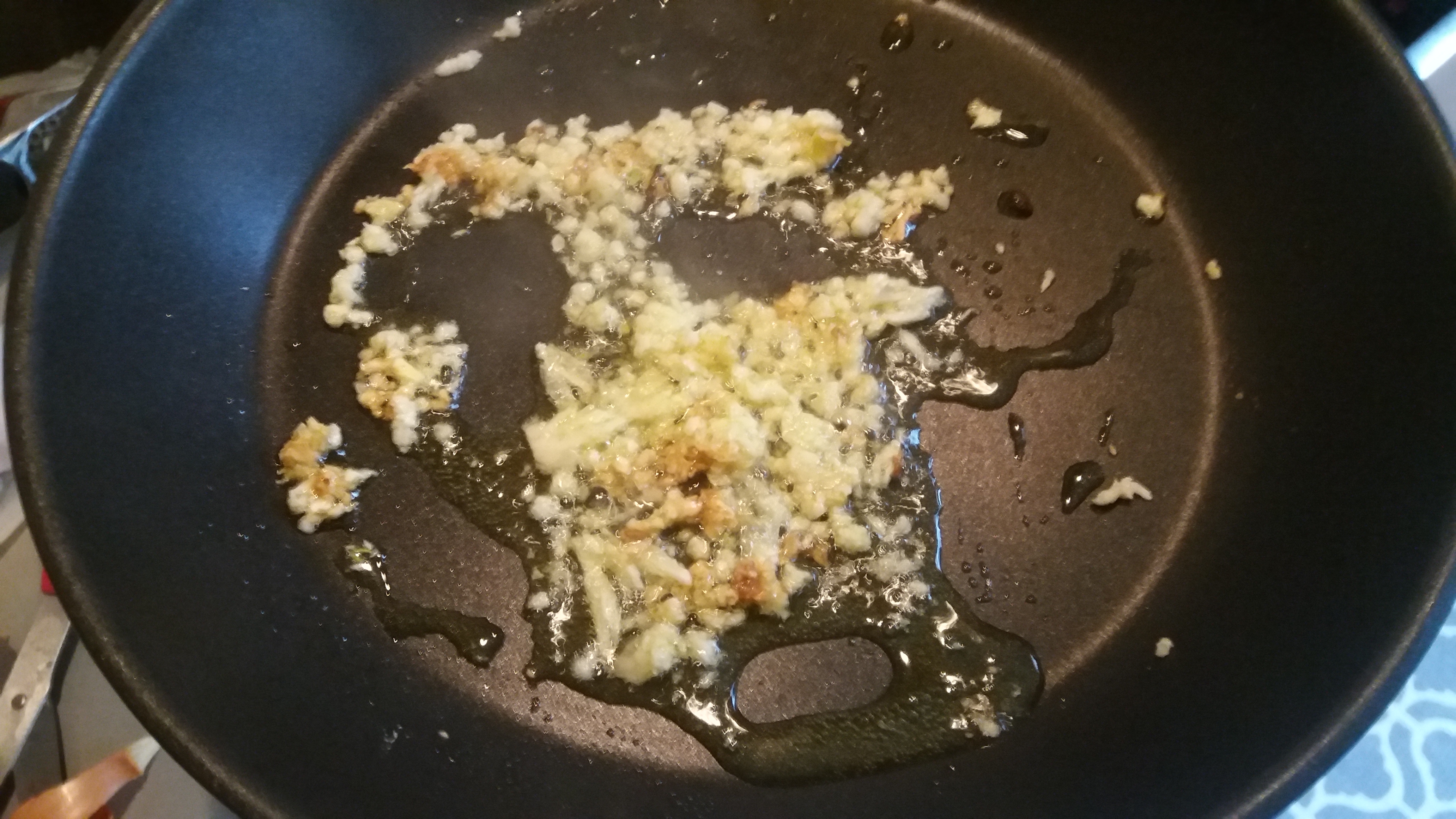 Mientras tanto, picamos o fileteamos los ajos y los ponemos en la cazuela con un poco de aceite a calentar a fuego medio.