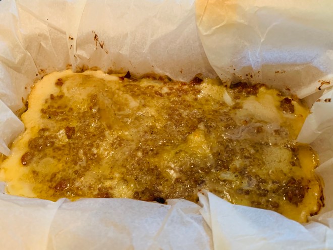 Mezclamos bien con una cuchara o con las manos y lo pasamos a un molde apto para horno (recomiendo uno alargado de unos 24cm, tipo bizcocho). Podéis forrar el molde con papel de horno para facilitar el desmolde, o bien engrasarlo ligeramente con aceite o mantequilla.