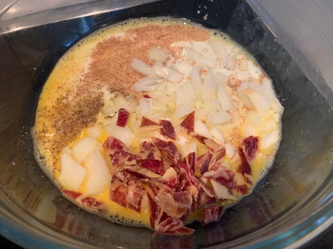 Picamos la cebolla y el jamon (y la carne, si no viniese ya asi).