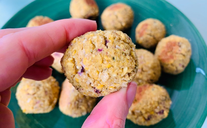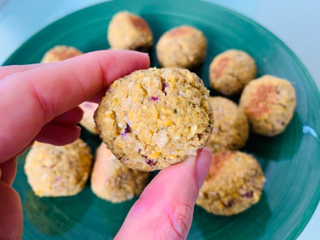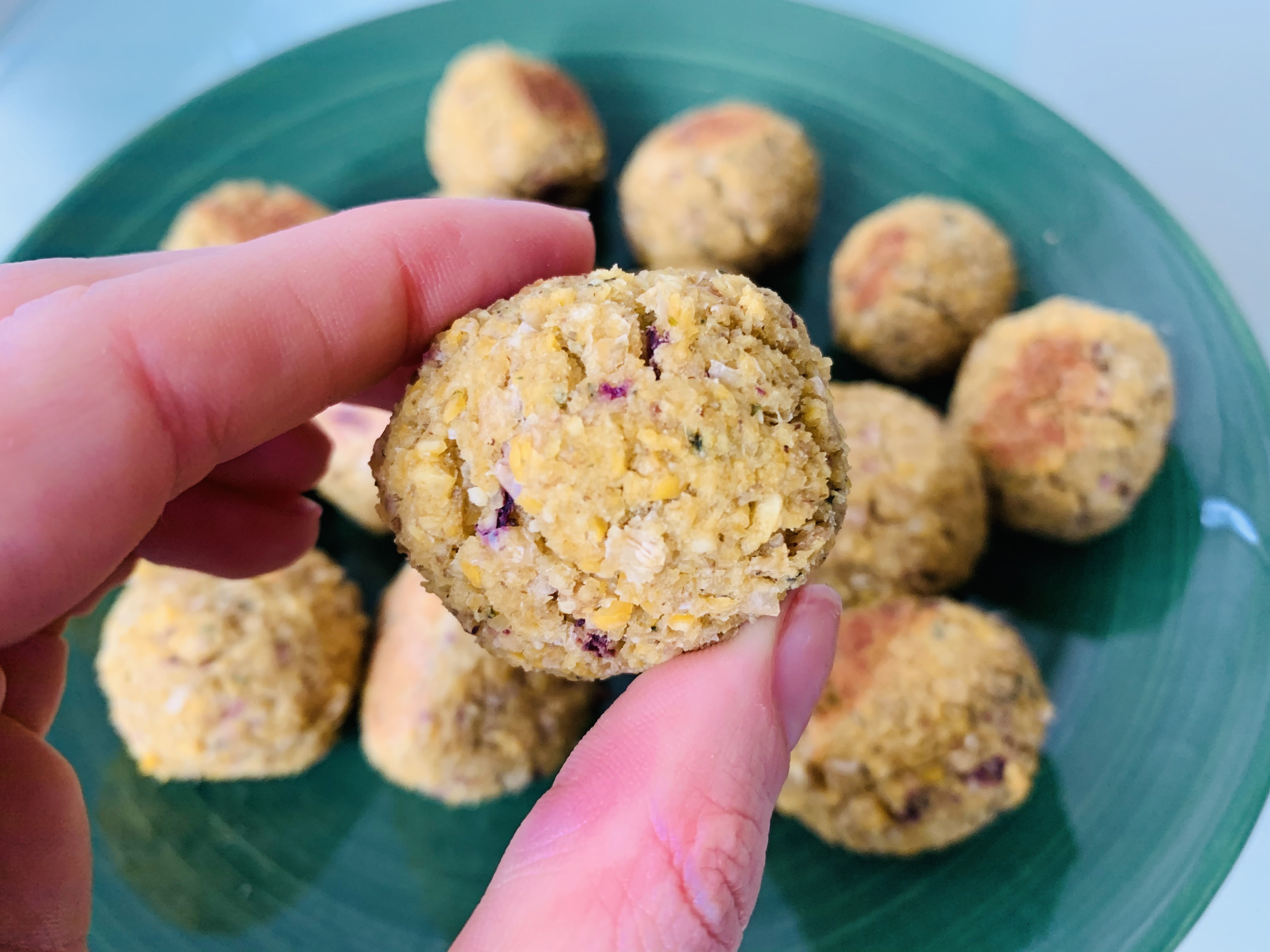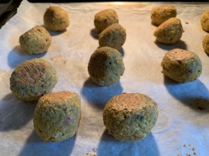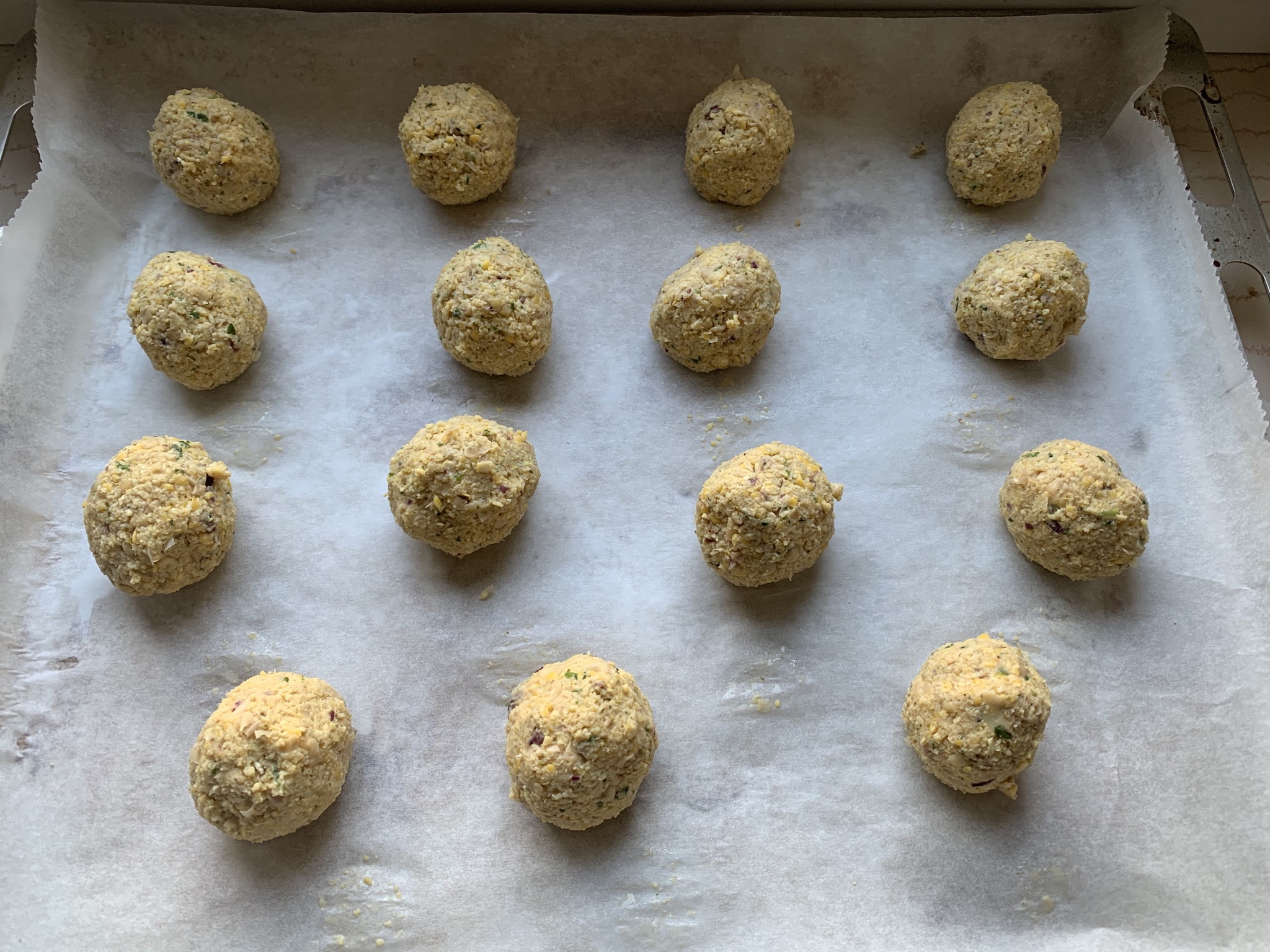Vamos sacando porciones de falafel y formamos bolitas tamaño pelota de golf. Las vamos colocando sobre una bandeja de horno forrada con papel de hornear.