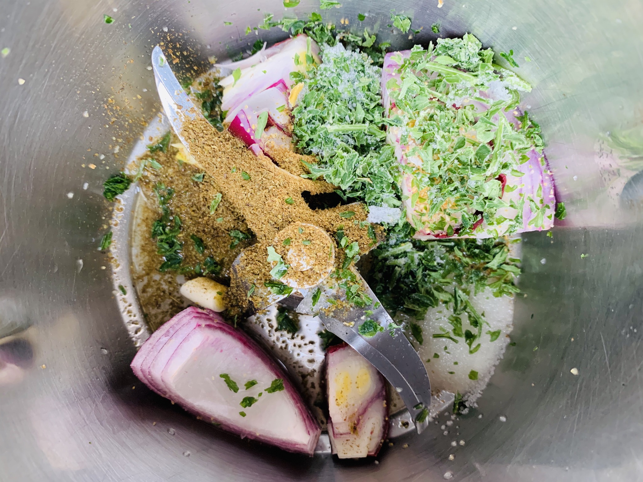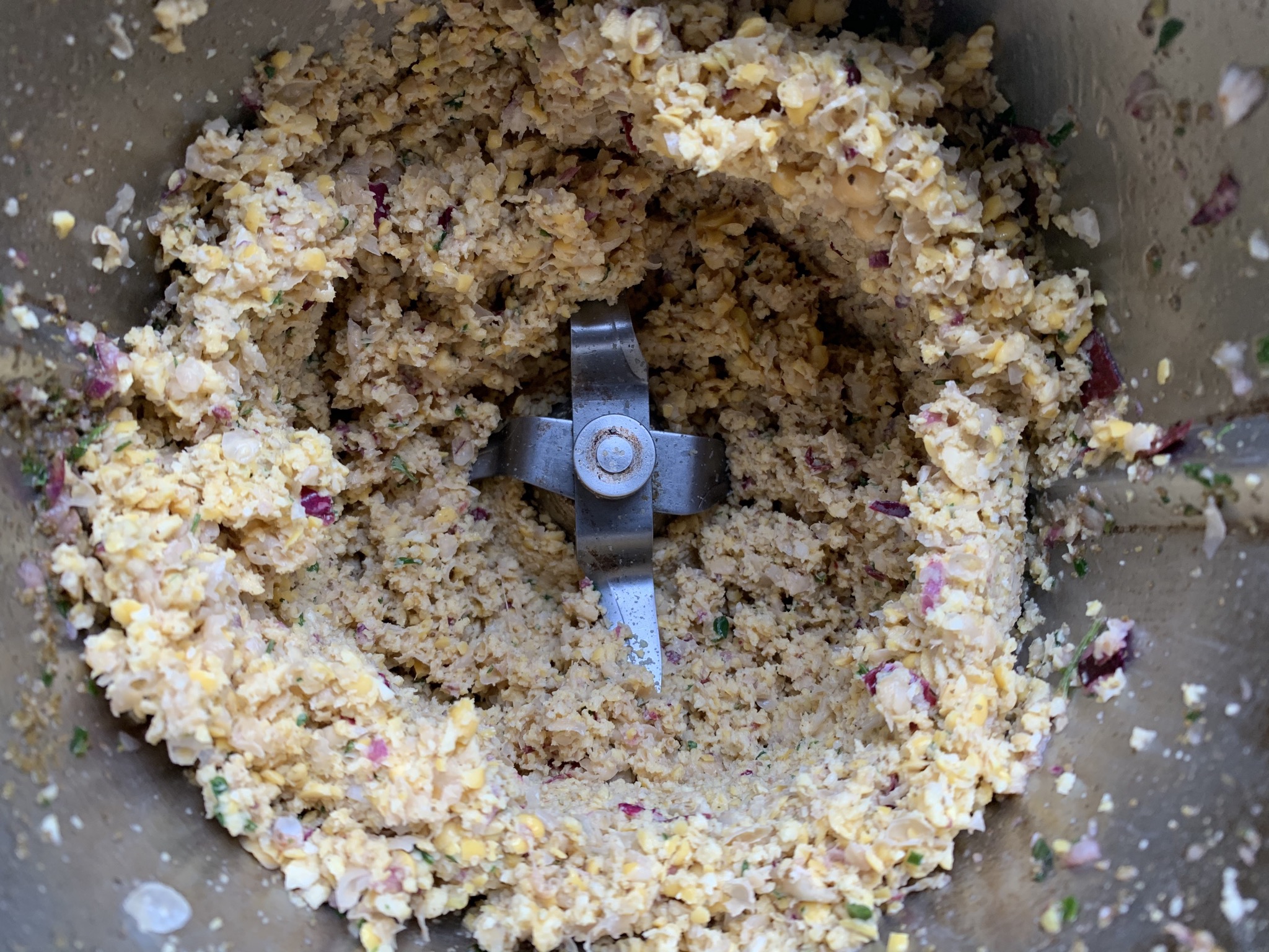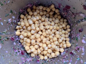 Una vez triturado esto, incorporamos los garbanzos y volvemos a triturar. OJO, no pretendemos que quede una masa tipo hummus, sino con más textura (no importa que quede algún garbanzo por ahí suelto).
