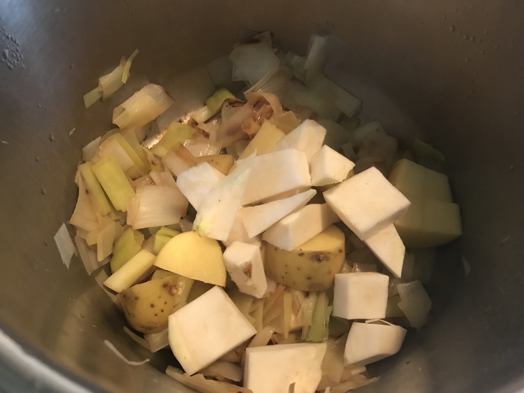 Cogemos una cazuela grandecita u olla express y calentamos un chorro de aceite a fuego medio. Pochamos los puerros con la tapa puesta y un poquito de sal, y removemos. Lo dejamos mientras pelamos el apionabo.
