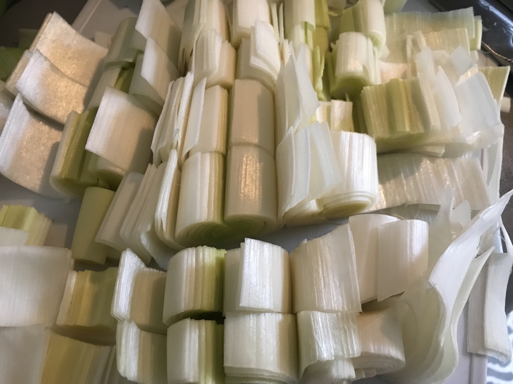 Comenzamos cortando los puerros: desechamos la parte verde y los cortamos por la mitad a lo largo. Los lavamos para quitar la tierra que suelen traer y los cortamos en rodajas.