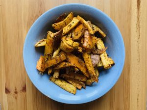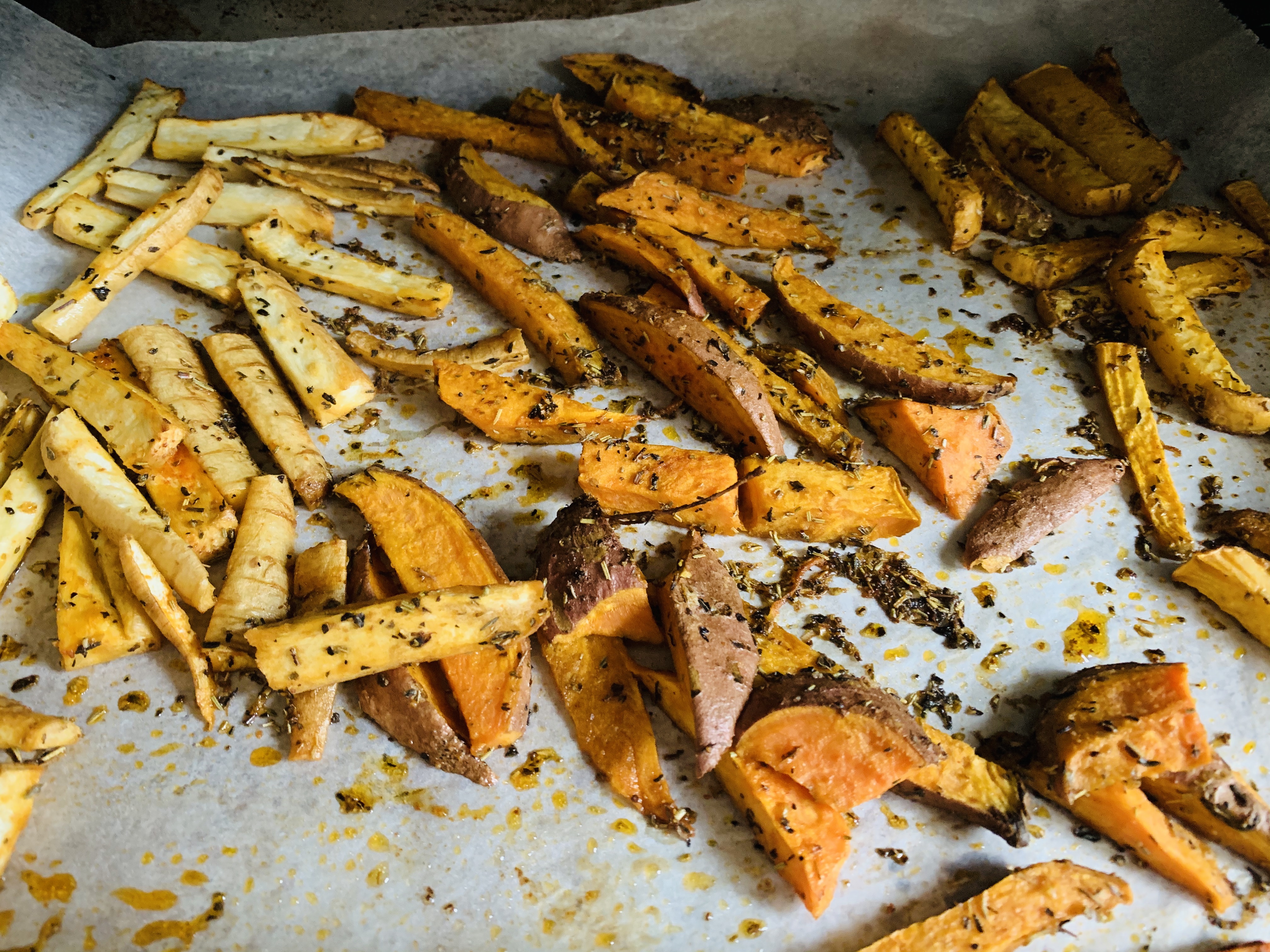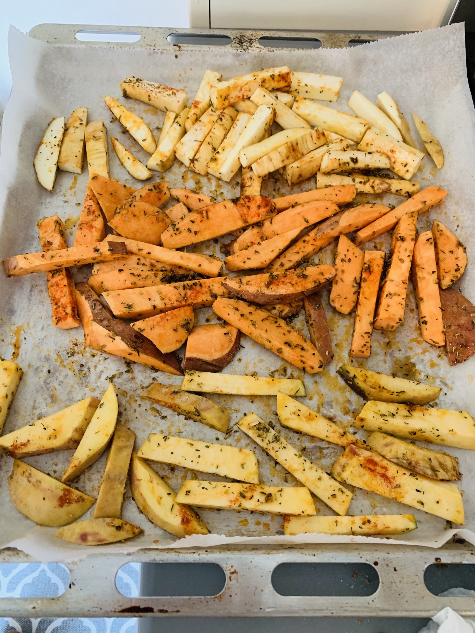Los extendemos en la fuente del horno y los embadurnamos con el aceite, la sal y las especias elegidas.