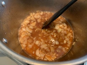 Pasados 3 minutos, subimos a fuego fuerte, y agregamos el vino y dejamos que se evapore el alcohol. Aprovechamos para rascar el fondo de la cazuela con una espátula de madera o silicona, ya que ahí habrán quedado los juguillos del solomillo.
