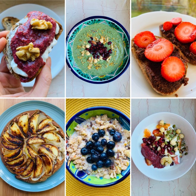 - Tostada de base de boniato (boniato laminado y cocinado al vapor hasta que esté blandito) + mantequilla de algún fruto seco/tahini + fresas o plátano